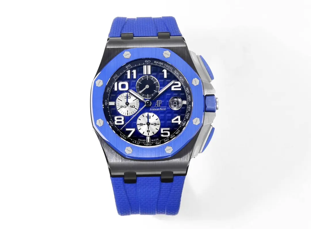 - Ceramic construction of high quality: This watch has a ceramic strap and case, which are made using Japanese zirconia technology. The result is a color that’s consistent, with a dense finish, without any pigments. Precision craftsmanship: The case, the bezel and the case back are all CNC-machined to achieve a perfect finish and avoid any sharp edges. Classic design elements: Dial features the AP grid with layered, perfectly polished squares. A sapphire lens magnifies the date at 3 o’clock, in keeping with the original design. Superior Hand-Finished Detail: The hand-filled luminous material imported from Switzerland is used to fill the hands and markers, giving them a bright and even luminescence. This closely matches the original. The enhanced movement uses a 7750 modified movement that mimics the 3126 Chronograph movement. It has subdials located at 12, 6 and 9 o’clock to represent small seconds, 12 hours, and 30 minute chronograph functions. This movement has been polished to enhance stability. This TC Audemars Pigot Royal Oak Offshore Chronograph is the ultimate in timepieces craftsmanship. It features a blue ceramic case, strap and precision engineering. The movement has been meticulously crafted. Explore the finest and see the difference in quality.