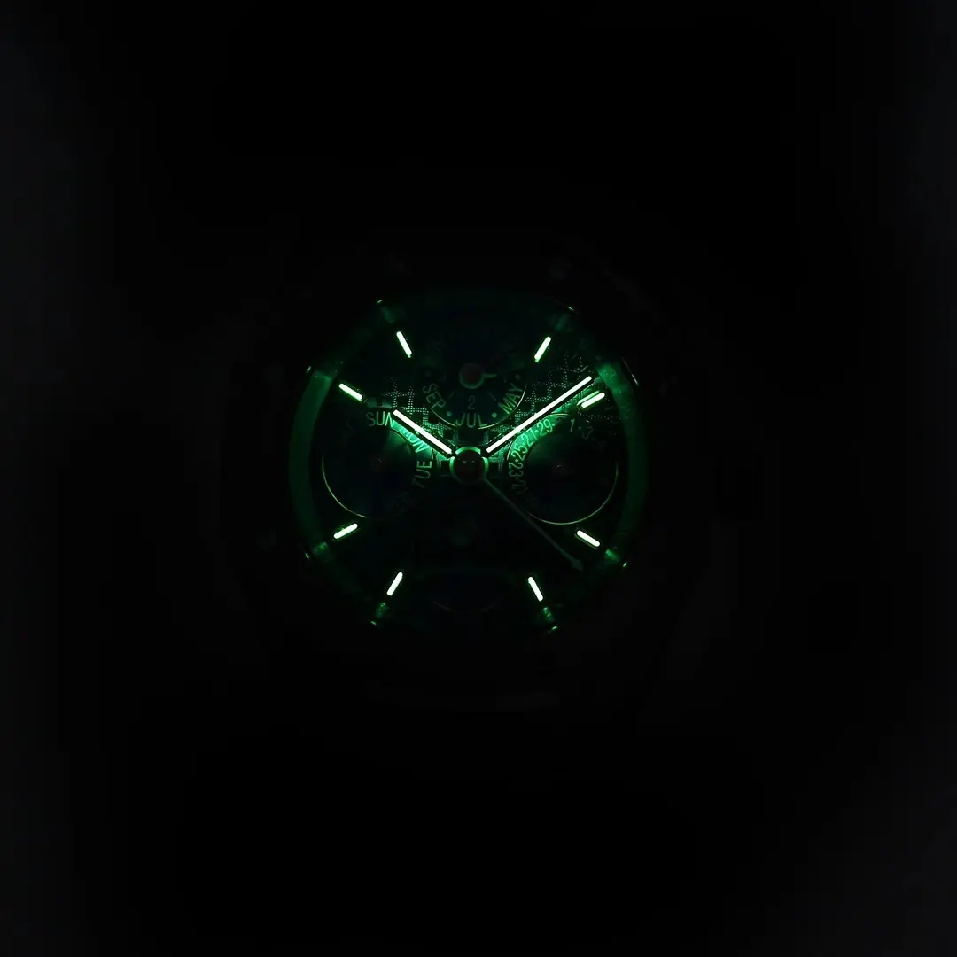 The watch features an elegant design with a blue dial, gold case and brings to mind the luxurious aesthetics of Audemars Piguet Royal Oak. Perpetual calendars display information like the day, date, month, and time. The perpetual calendar also displays the phases of the moon. The case is made of 316L stainless steel, which ensures durability and a premium feel. The luminescent markers and hands make it possible to see the time even in low light. Sapphire Crystal: The sapphire crystal is resistant to scratches and coated with anti-reflective material for long lasting durability. Audemars-Piguet Royal Oak Perpetual calendar is a timepiece that blends elegance and functionality. Classic elegance is provided by the blue dial and gold case. Explore the following luxury brands for a similar experience, including options like that offer the same high-quality design.