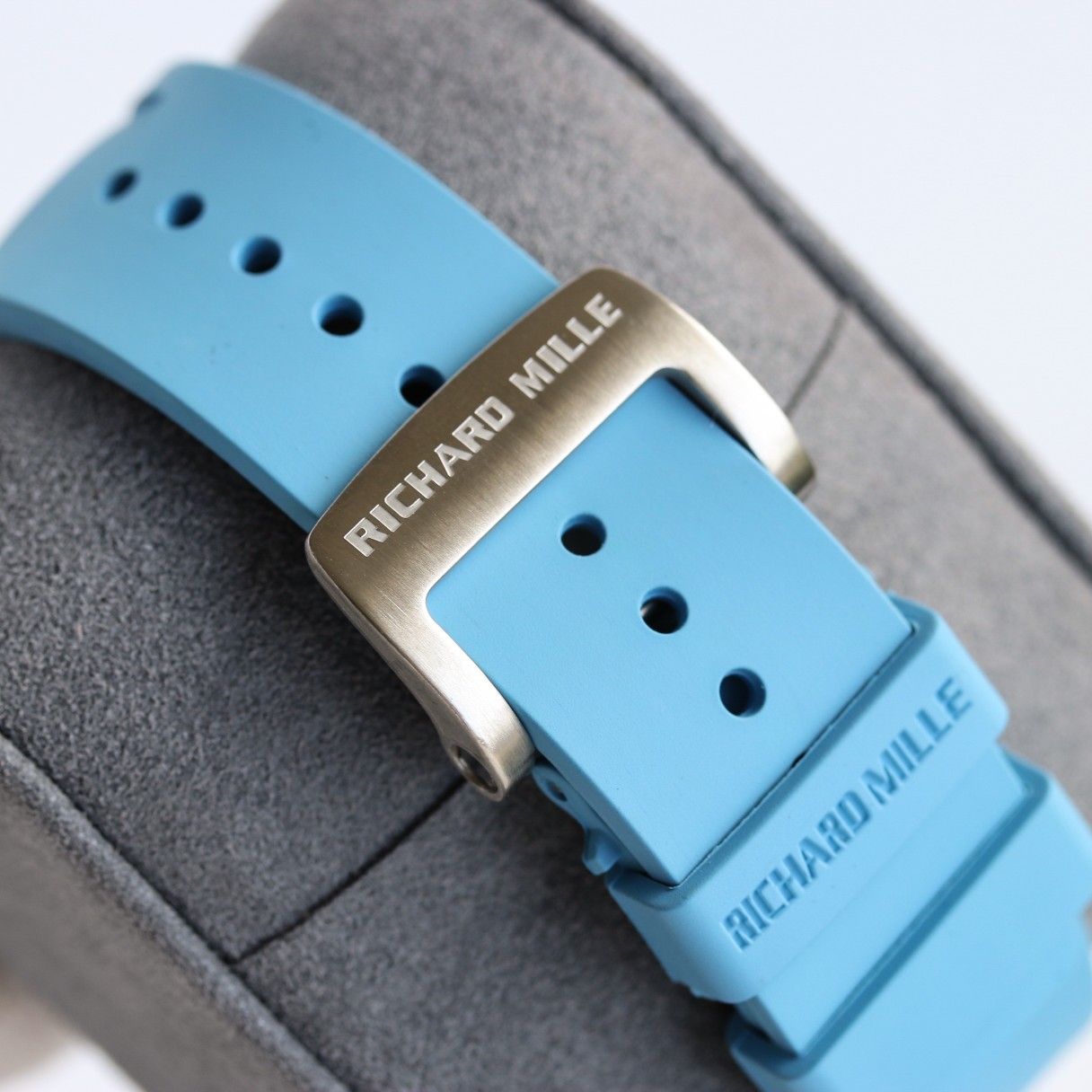 Enjoy the ultimate luxury watch experience with the Best Richard Mille RM11-03 Carbon Fiber Chronograph Replica Watch. This AAA Swiss-quality replica watch comes in a 50mm titanium case, coupled with a blue rubber strap and a blue ceramic fixed bezel that reflects power and elegance. The black skeleton dial, accompanied by silver-tone hands and Arabic numeral hour markers, provides a graphically striking, high-tech look, further complemented by a tachymeter scale on the outer rim.