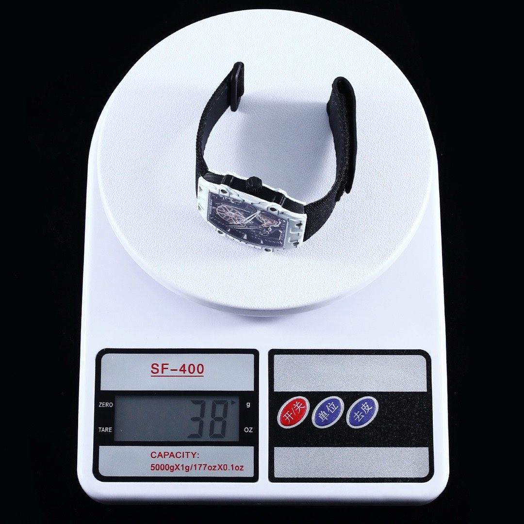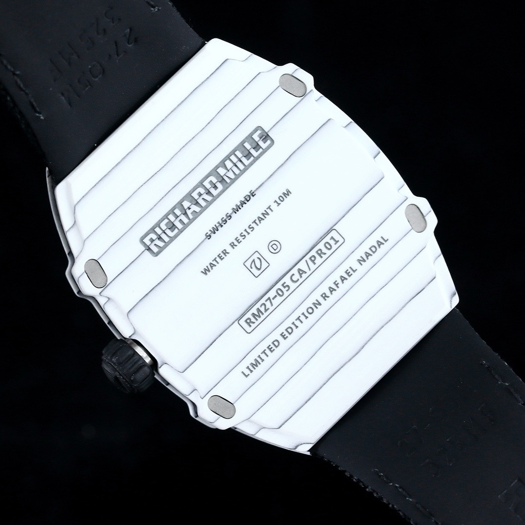 The RM 27-05 Flying Tourbillon Rafael Nadal replica watch showcases exceptional craftsmanship with a striking white barrel-shaped carbon case, blending elegance and durability. The skeletonized dial reveals the intricate geometric beauty of its V-shaped bridge and tourbillon plate, creating a visual masterpiece. The open barrel mechanism displays the winding status, while the gear sets at 2 o’clock and 8 o’clock form a seamless connection.
