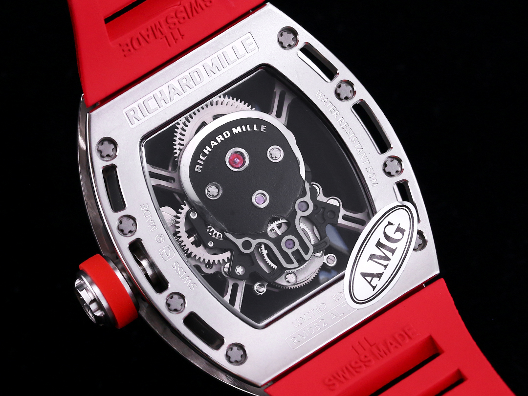 This Replica RICHARD MILLE RM 52 is a total head-turner. It rocks a skull-shaped skeleton dial, a solid 43mm stainless steel case, and a bright red rubber strap that really pops.