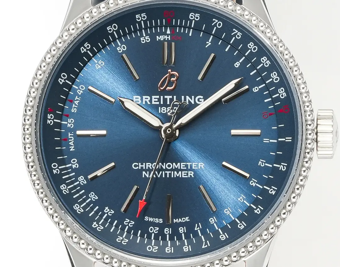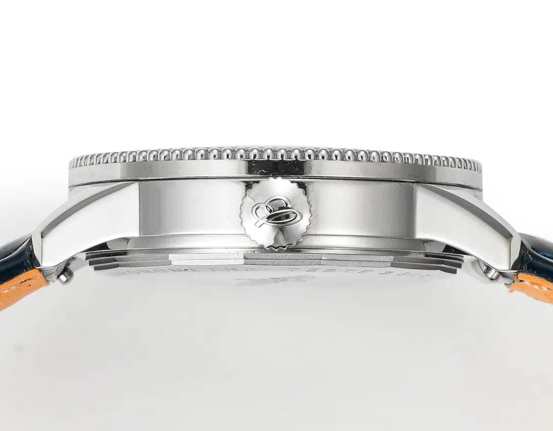 The pilot’s slide rule. Since 1952, the Navitimer’s circular slide rule bezel, three-register chronograph, and AOPA wings logo define aviation chronographs. Powered by an automatic movement behind scratch-resistant sapphire crystal with AR coating.