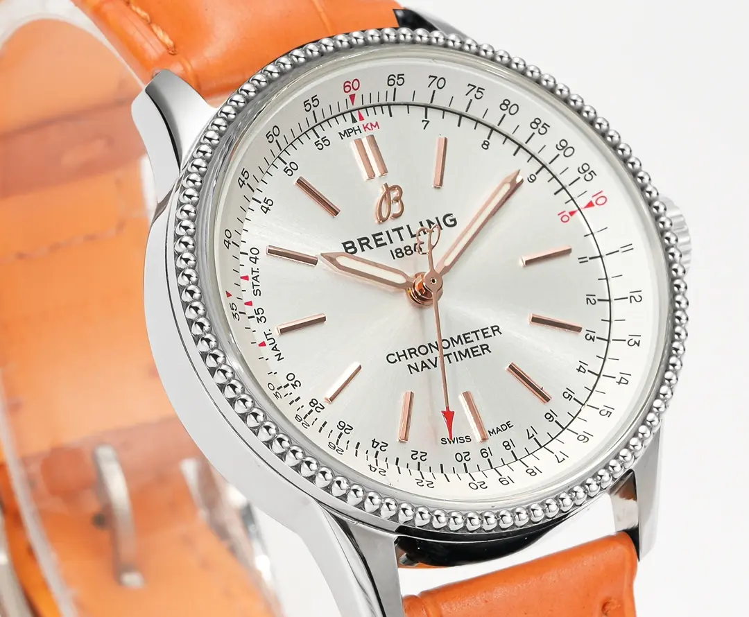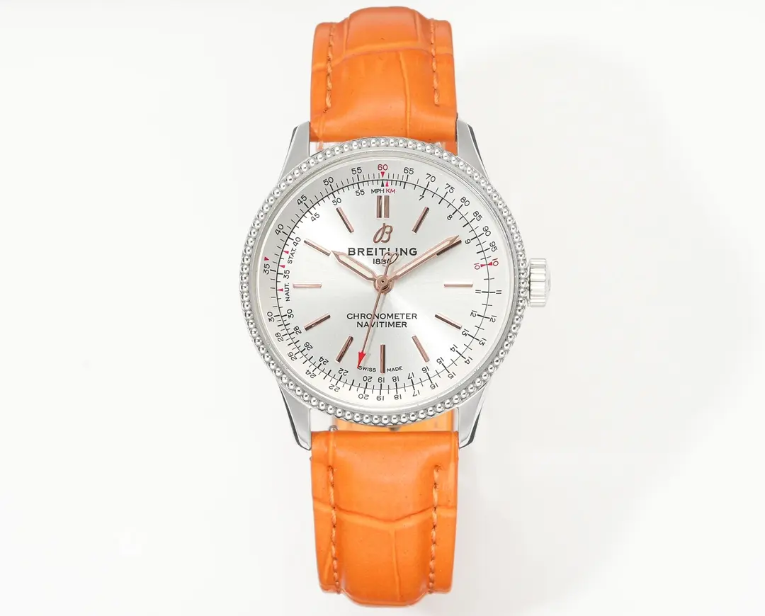 Breitling’s Women’s Navitimer Automatic Watch combines timeless elegance and modern precision. This watch is a great statement for any event. It features a silver dial and an orange leather band, embodying the sophistication of a.