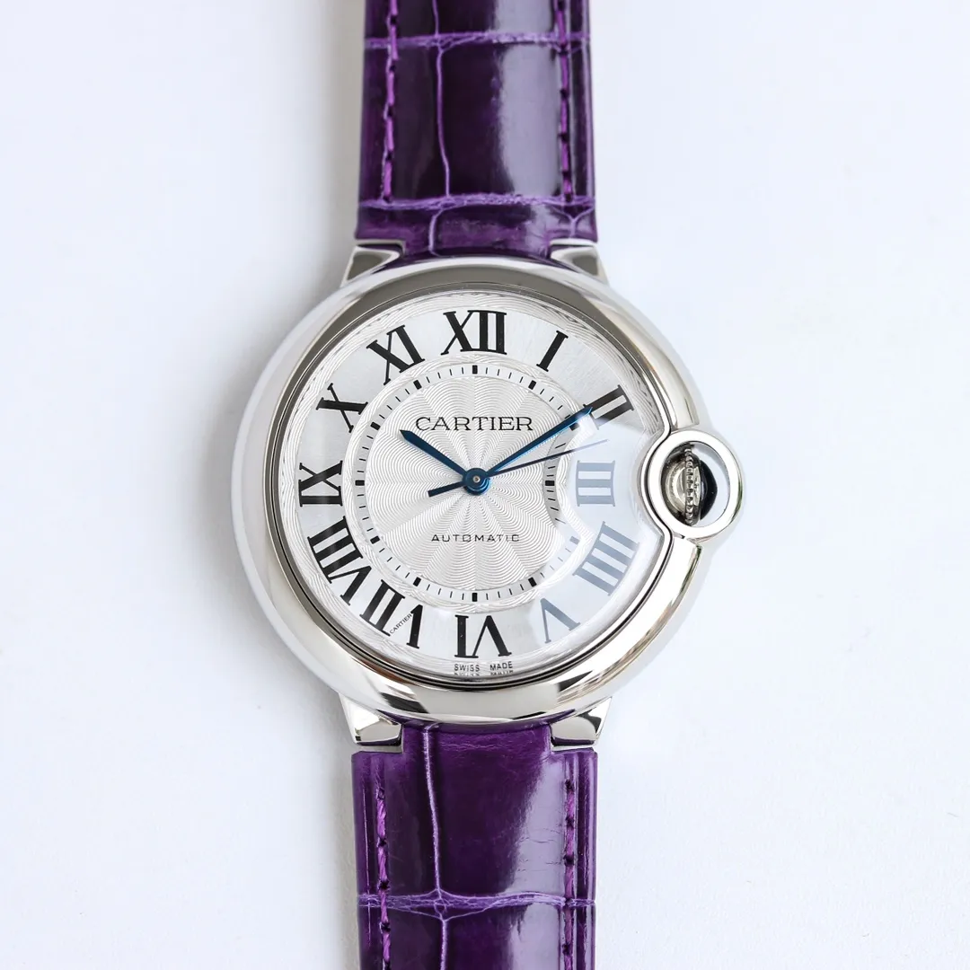 The Cartier Ballon Bleu Purple Leather Watch features a dial that measures 36mm and is suitable for both men and women. This timepiece is made with American premium alligator and sapphire glass. It features a crown with blue steel hands and a recessed cabochon. Original folding clasp, CNC-engraved dial, and unsurpassed quality make this a unique addition to any collection.