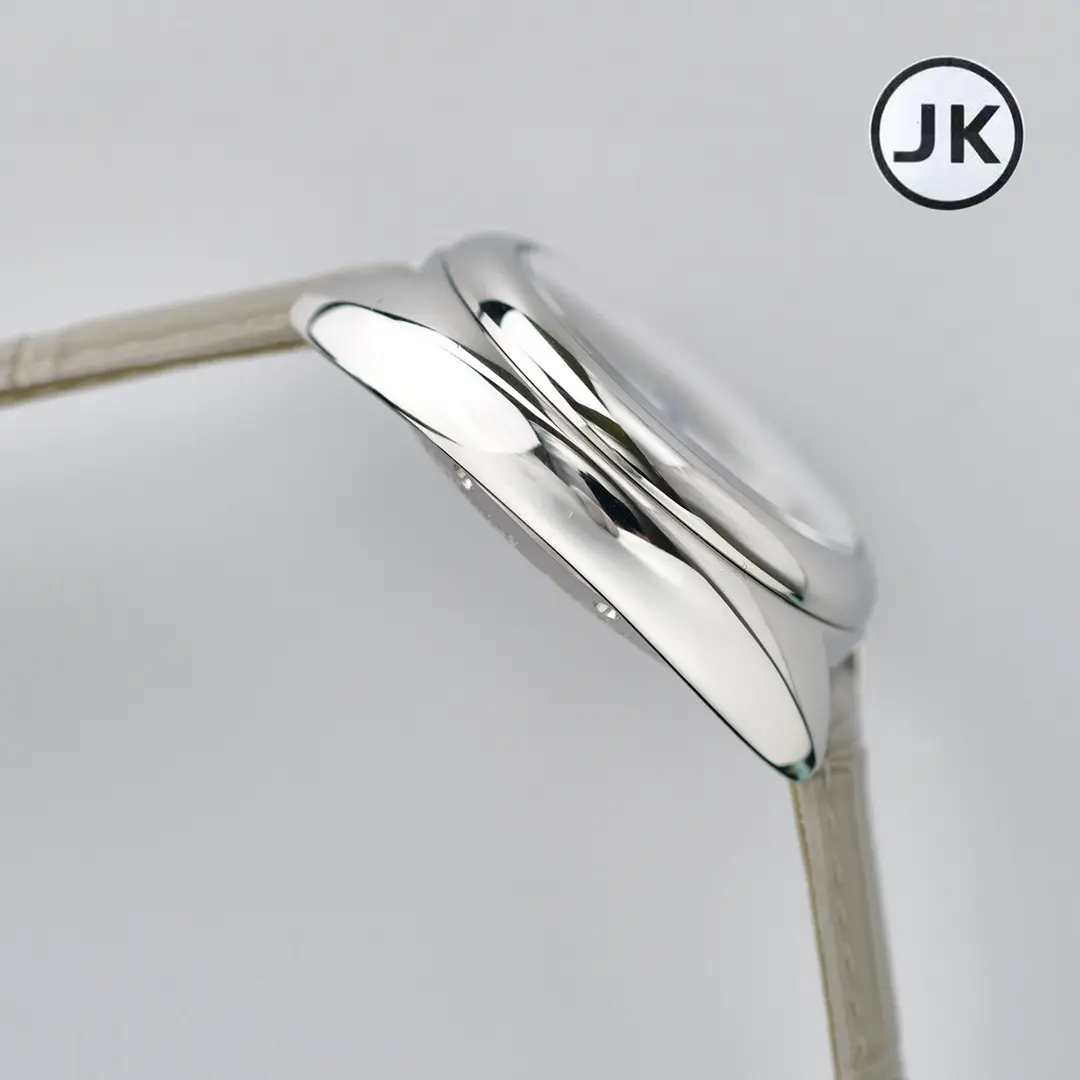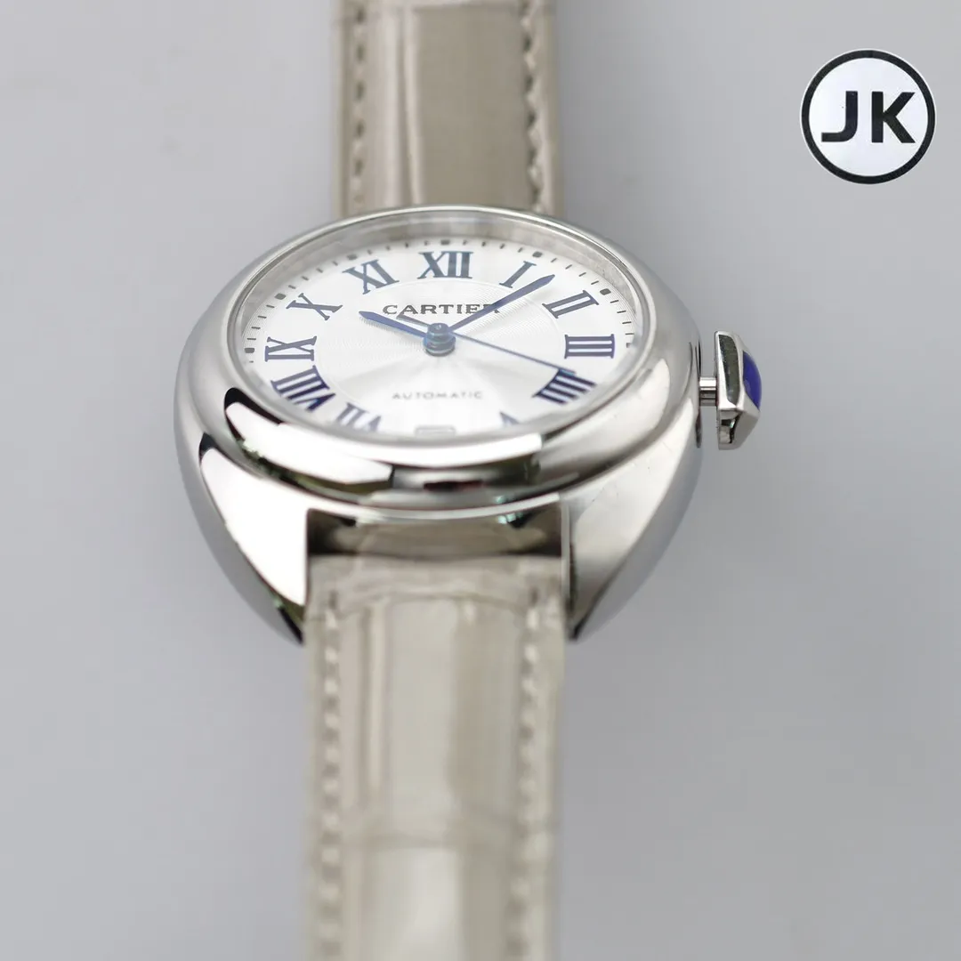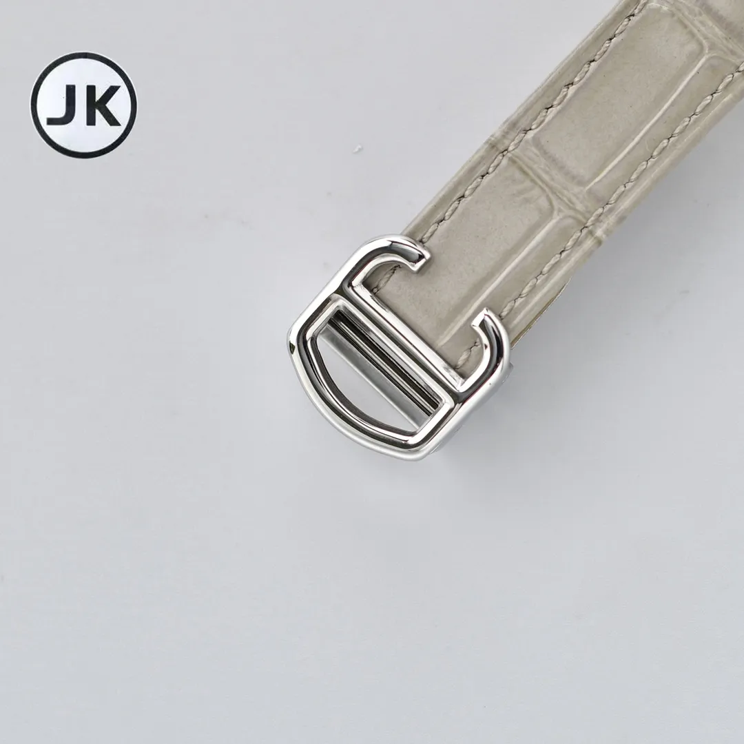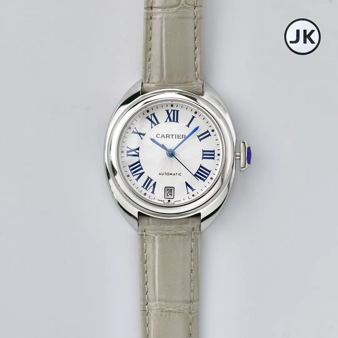 - The sapphire crystal is resistant to scratches and offers clarity. A grey leather strap adds an elegant touch to the watch. Roman Numerals This dial features raised Roman numerals, which give it an elegant and clean appearance. This Cartier CLE DE Cartier key automatic watch features a silver case and a grey leather band. This timepiece has a combination of elegance, precision, and durability. Explore options such as a