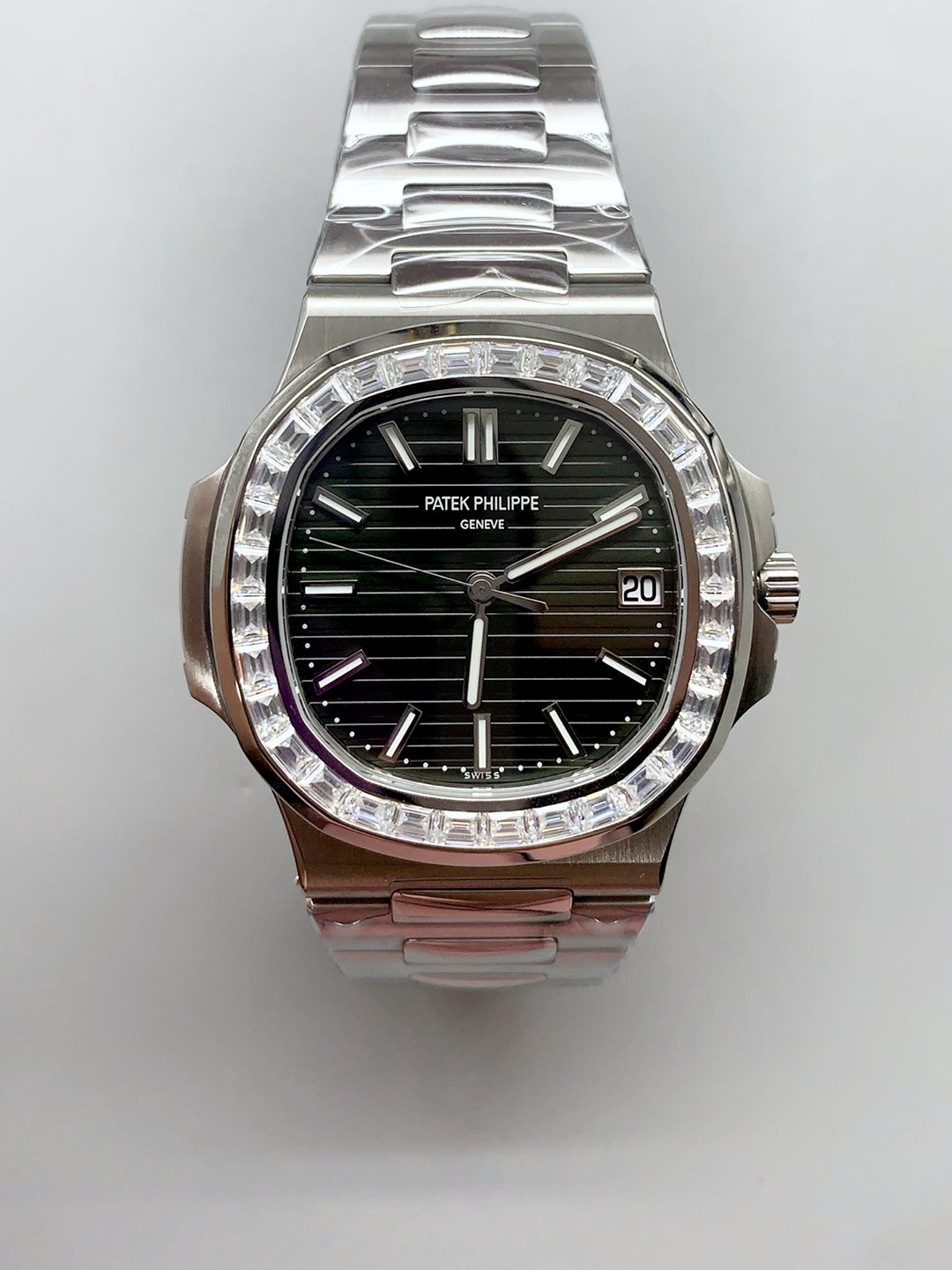 Cartier Santos Full Diamond Bezel Silver Watch — Premium 1:1 super clone. Case: Stainless steel case, silver-brushed or yellow gold PVD finish. Crystal: Genuine sapphire crystal with AR coating. Movement: Clone Cal. 1847 MC automatic (28,800 bph). Price: $699. 12-month movement warranty. Free worldwide shipping on orders over $1,200.