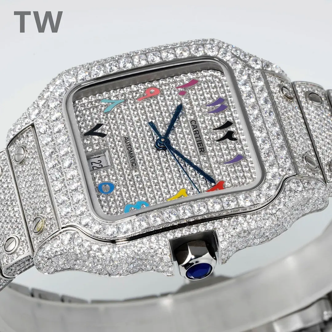 Experience the ultimate in luxury with the Cartier Santos Large Diamond Bezel Full Pave Watch. This 40mm timepiece combines advanced craftsmanship with a vibrant, colorful dial, making it a standout accessory.