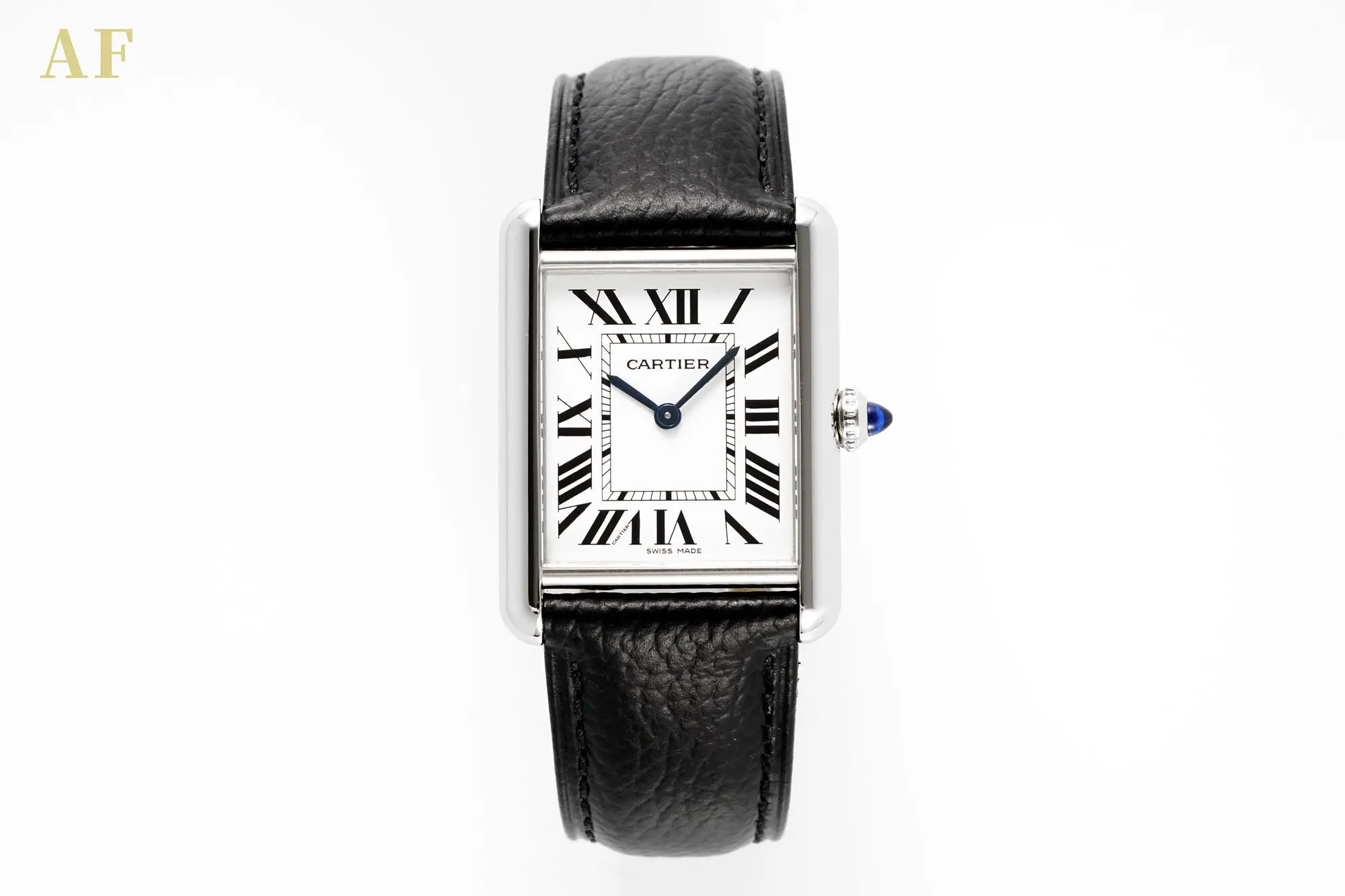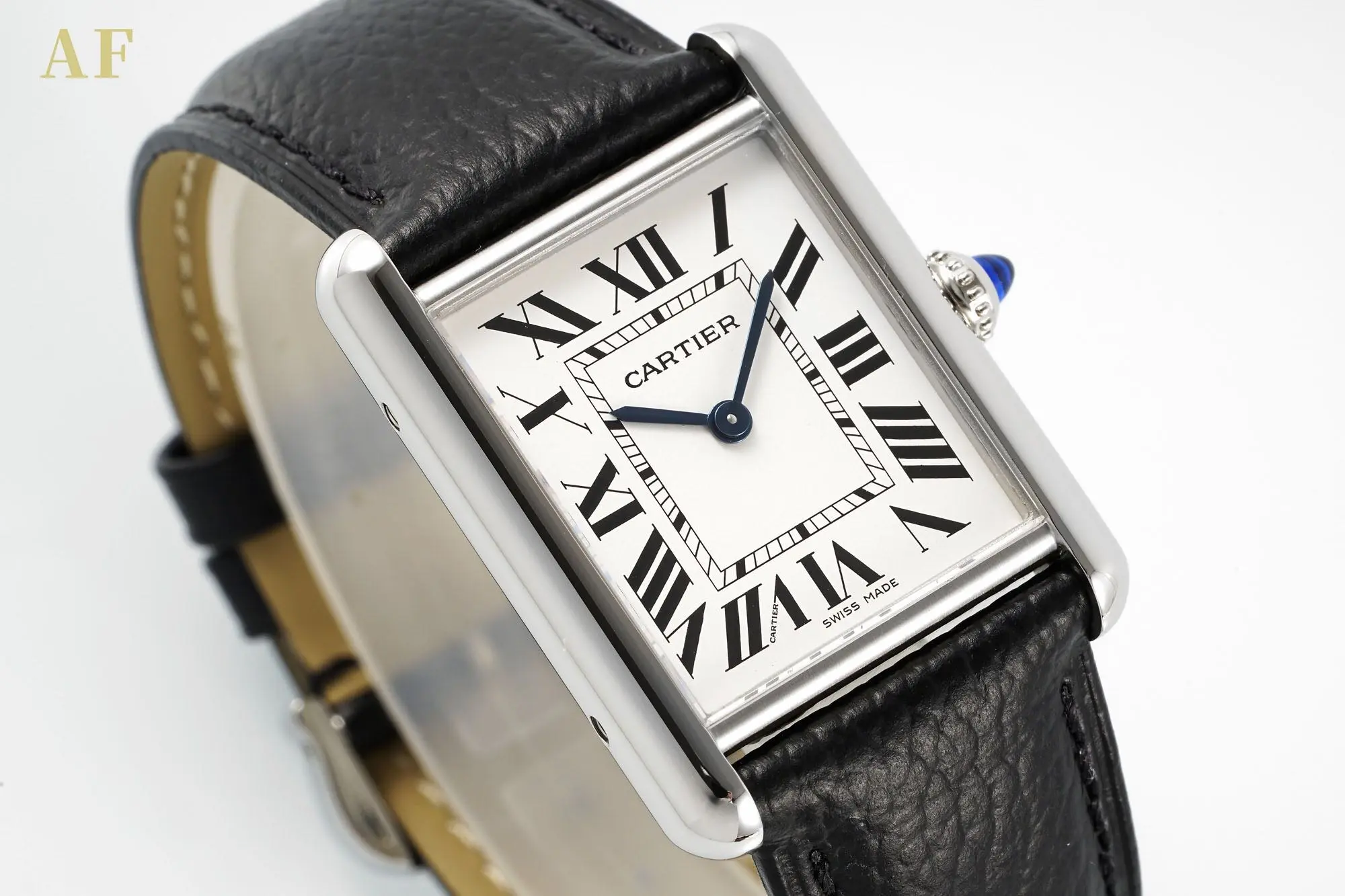 the Tank Solo Medium Quartz Watch combines elegance with functionality. Featuring a black leather strap, silver case, and a Swiss quartz movement, it’s both stylish and reliable.