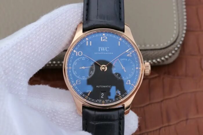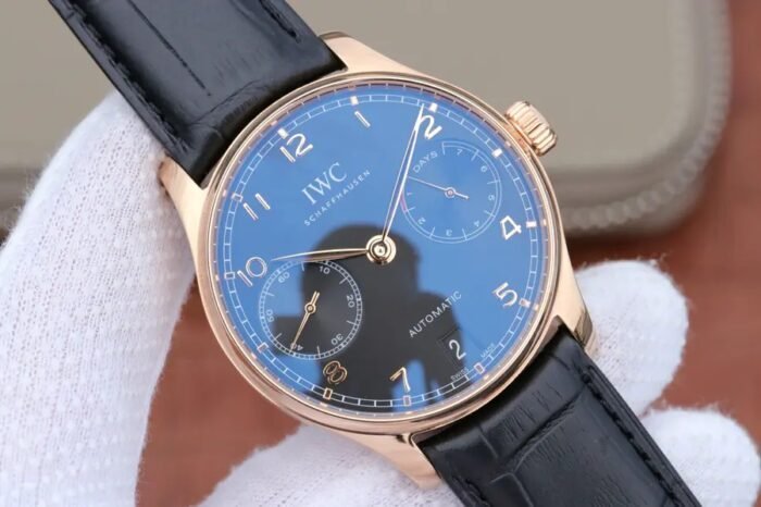 IWC Portuguese series IW5034 18K Rose Gold — Premium 1:1 super clone. Case: 316L stainless steel case, polished finish.. Crystal: Genuine sapphire crystal with AR coating.. Movement: Clone Cal. 52010 (28,800 bph, 7-day power reserve).. Price: $1650. 12-month movement warranty. Free worldwide shipping on orders over $1,200.