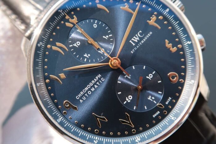 IWC Portuguese Chronograph IW371404 — Premium 1:1 super clone. Case: 316L stainless steel case, polished finish. Crystal: Genuine sapphire crystal with AR coating. Movement: Clone Cal. 52010 (28,800 bph, 7-day power reserve). Price: $1650. 12-month movement warranty. Free worldwide shipping on orders over $1,200.