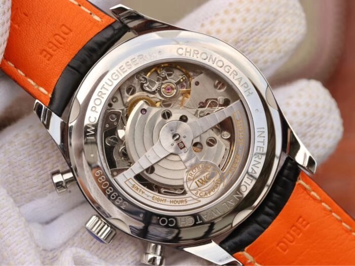 IWC Portuguese Chronograph IW371404 — Premium 1:1 super clone. Case: 316L stainless steel case, polished finish. Crystal: Genuine sapphire crystal with AR coating. Movement: Clone Cal. 52010 (28,800 bph, 7-day power reserve). Price: $1650. 12-month movement warranty. Free worldwide shipping on orders over $1,200.