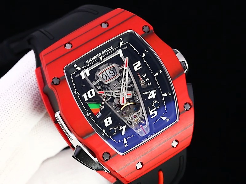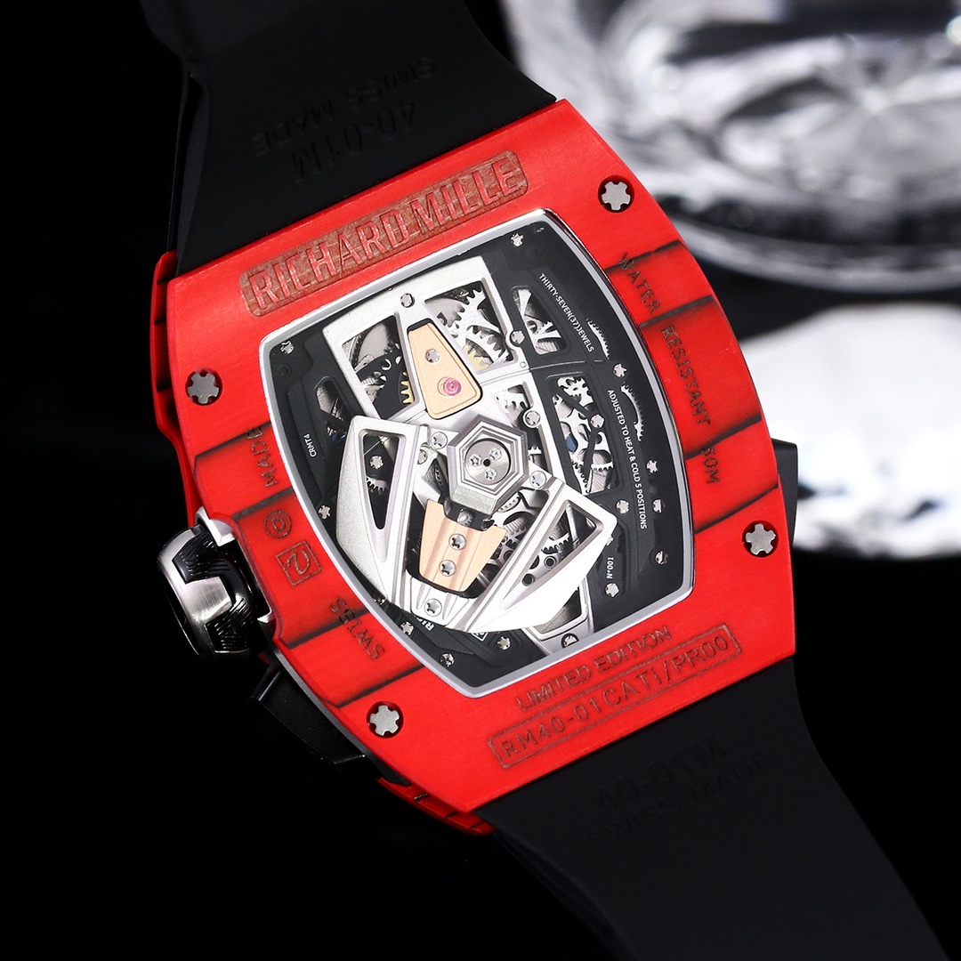 The replica Richard Mille RM 40-01 is immediately distinguishable by its brazen and sporty charisma on top of its complex mechanical engineering. Its 48.25mm × 41.80mm red carbon fiber case contrasts sharply against the black rubber band that provides both comfort and a strong visual impact. The skeletonized dial reveals the complexity of the mechanical structure below the dial, with 3-dimensional Arabic numeral hour markers bringing a contemporary and high-tech flair.