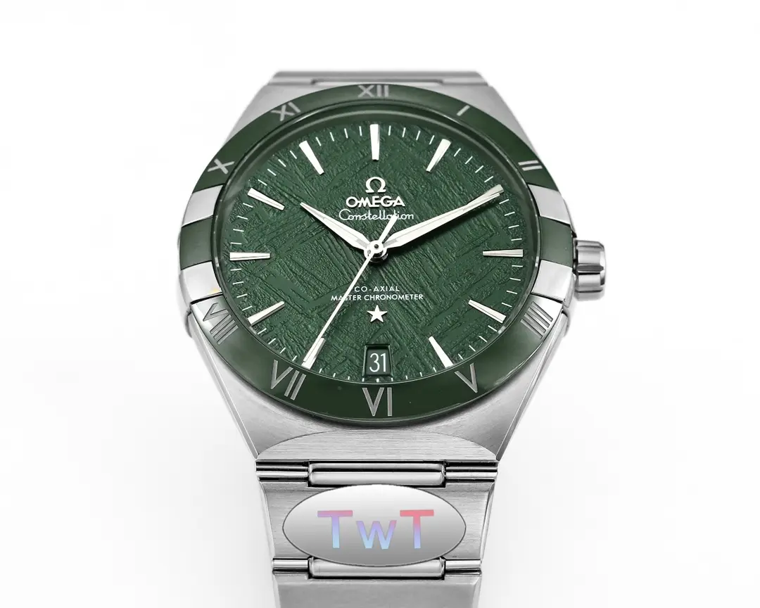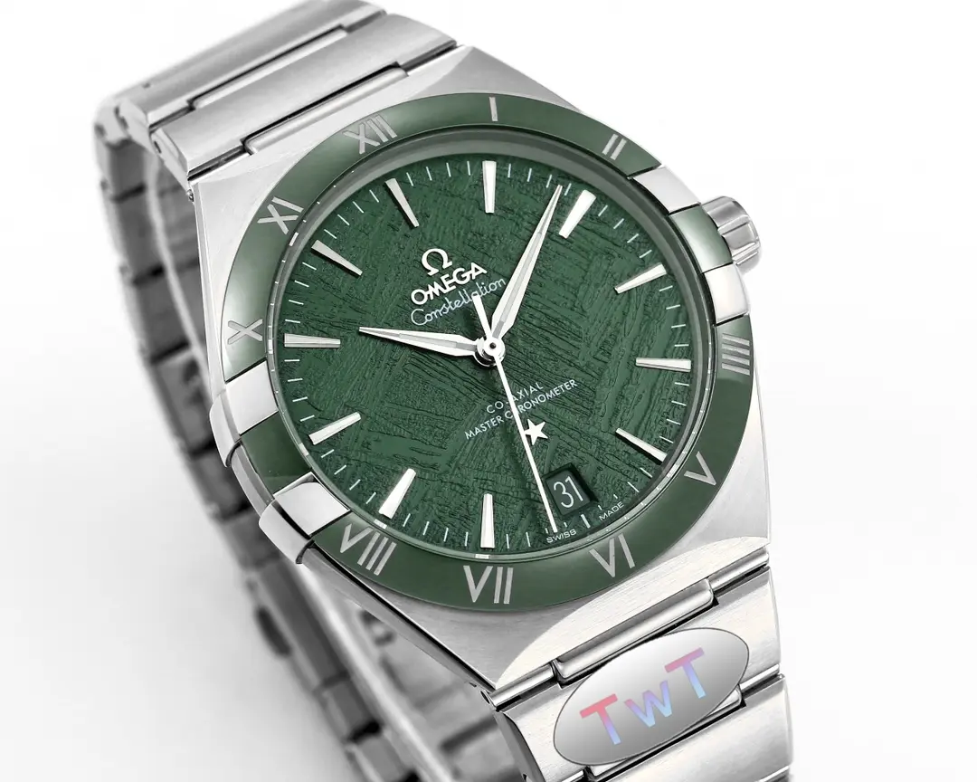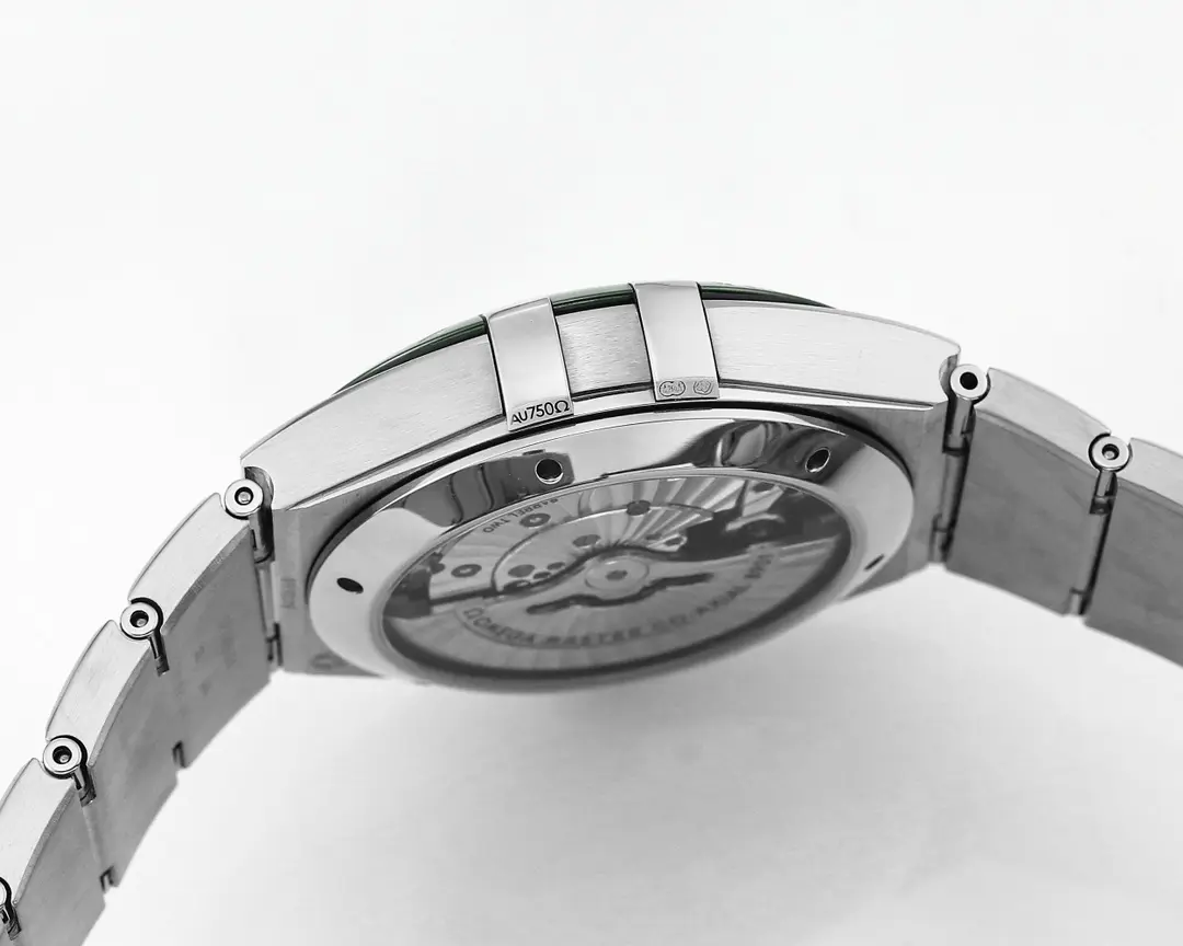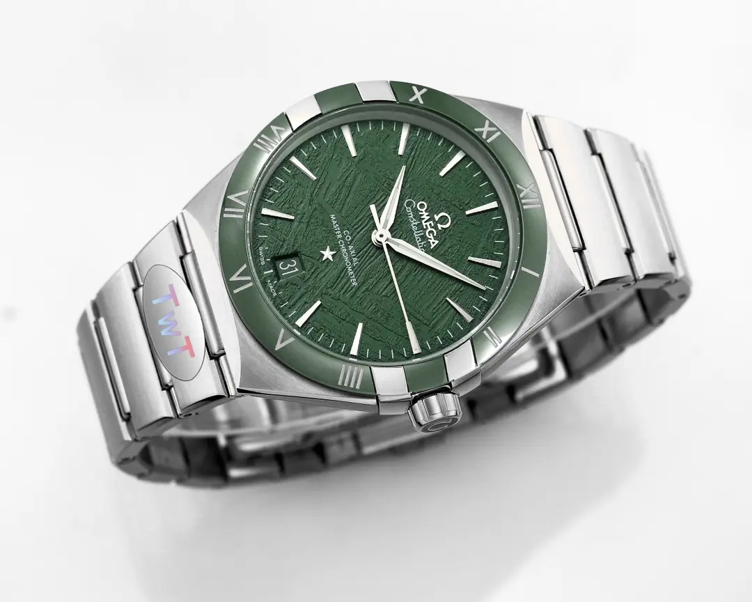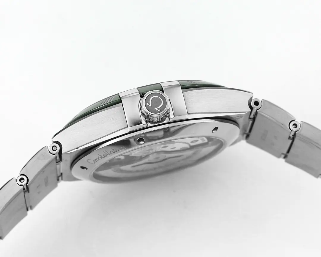 The Omega Constellation Star Watch 5th Gen combines luxury and precision with its green dial, ceramic bezel, and stainless steel bracelet. This timepiece offers a sophisticated look with modern functionality.