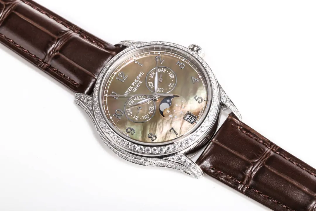 - Moon Phase and Annual Calendar: This watch combines a practical moon phase display with a functional annual calendar. It only requires one adjustment yearly. Diamond Case: This watch is decorated with diamonds to enhance its luxury appearance. The dial is made of lustrous Mother-of Pearl with Arabic numerals in gold tone applied for a clear, elegant reading of the time. Sub-Dials