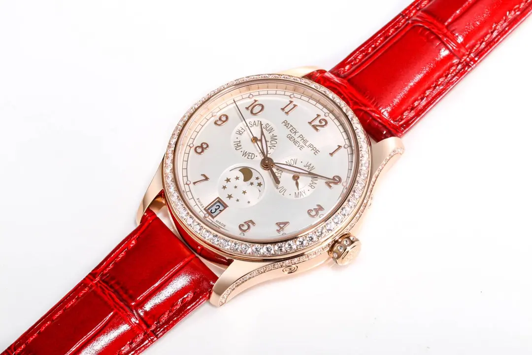 Lunar Phase and Calendar: The combination of a lunar phase display that is practical with an annual calendar. The only adjustment required each year is to rotate the dial. Rose-gold case with diamonds enhances its luxurious appeal. The dial has a mother of pearl face, with gold Arabic numerals and gold hands. It also features gold Arabic applied numbers. Subdials With Date Windows: At nine o’clock, there are subdials for day and month. And at six o’clock, a date and moon phase window is included. Patek Philippe Seal Certified Movement of High Quality: The watch features the Patek Philippe Seal Certified 324S QA LU automatic movements. Italian Leather Strap, Includes: A red leather strap with a diamond-set buckle. Patek Philippe Women’s Watch: This watch combines a rose gold case with a red leather strap, and includes an annual calendar as well as displaying the moon phase. This is an elegant and timeless example of elegance, perfect