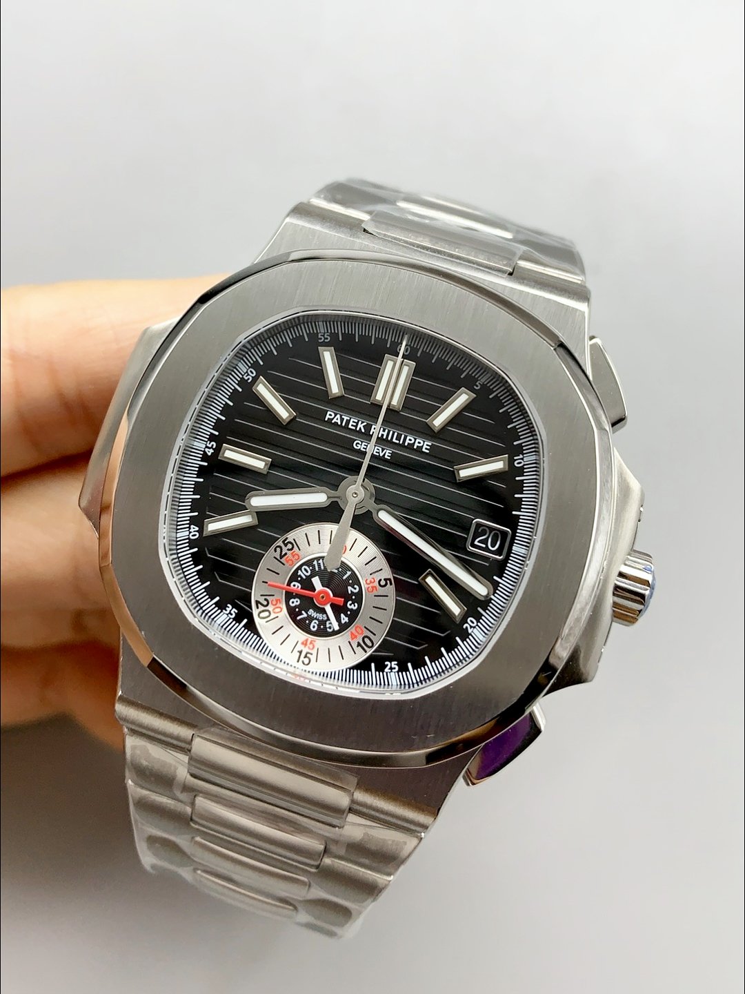 Patek Philippe Nautilus 5980 Silver Chronograph – Watch & Excellence — Premium 1:1 super clone. Case: 904L stainless steel or 18k gold case. Crystal: Genuine sapphire crystal with AR coating. Movement: Clone Cal. 5711A (28,800 bph, date at 3 o'clock, small seconds). Price: $900. 12-month movement warranty. Free worldwide shipping on orders over $1,200.