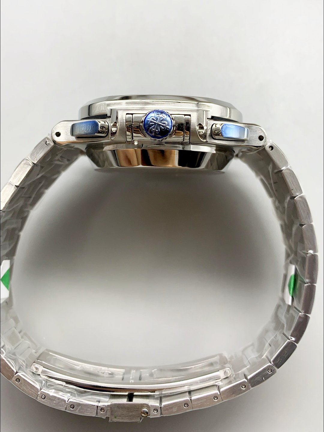 Patek Philippe Nautilus 5726/1A Blue Rubber — Premium 1:1 super clone. Case: 904L stainless steel or 18k gold case. Crystal: Genuine sapphire crystal with AR coating. Movement: Clone Cal. 5711A (28,800 bph, date at 3 o'clock, small seconds). Price: $900. 12-month movement warranty. Free worldwide shipping on orders over $1,200.