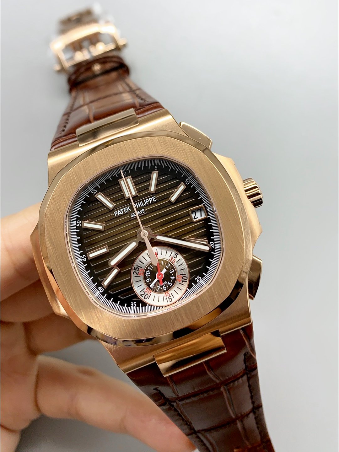 Patek Philippe Nautilus 5980/R Chronograph Rose Gold on 904L Steel Case in Brown Dial () — Premium 1:1 super clone. Case: 904L stainless steel or 18k gold case. Crystal: Genuine sapphire crystal with AR coating. Movement: Clone Cal. 5711A (28,800 bph, date at 3 o’clock, small seconds). Price: $1,650. 12-month movement warranty. Free worldwide shipping on orders over $1,200.