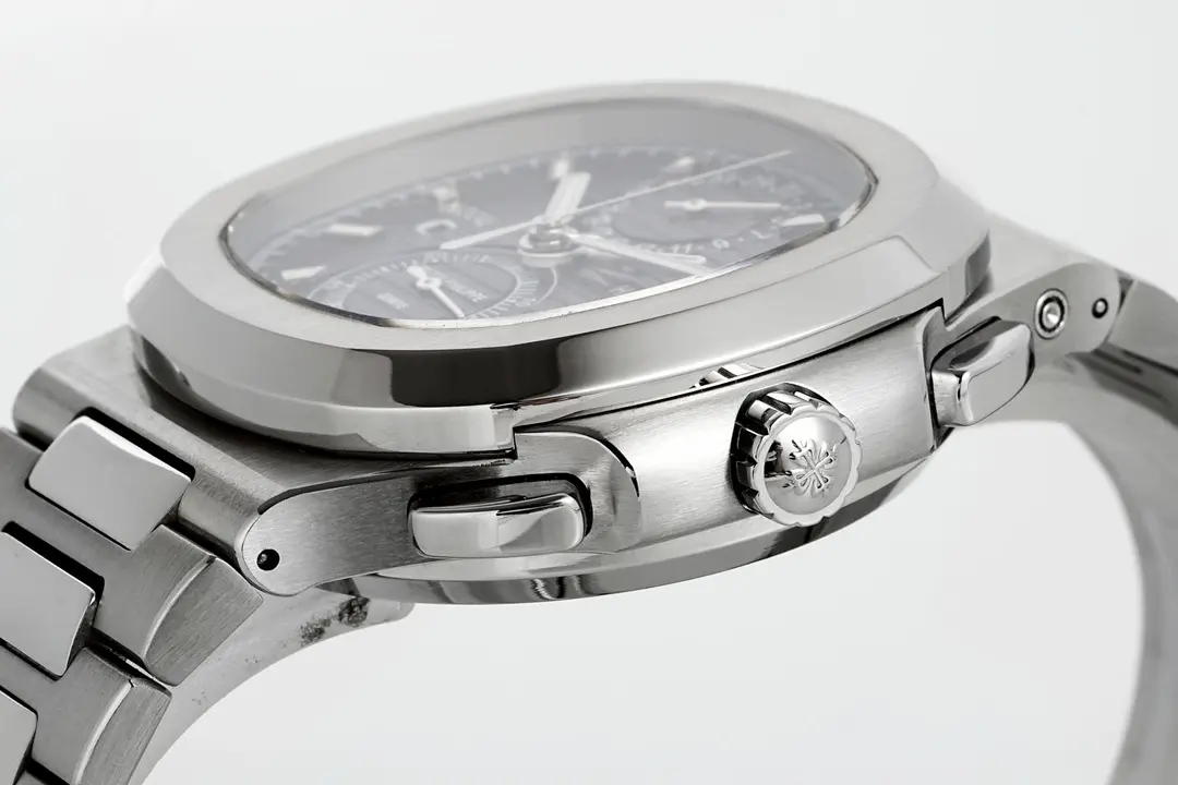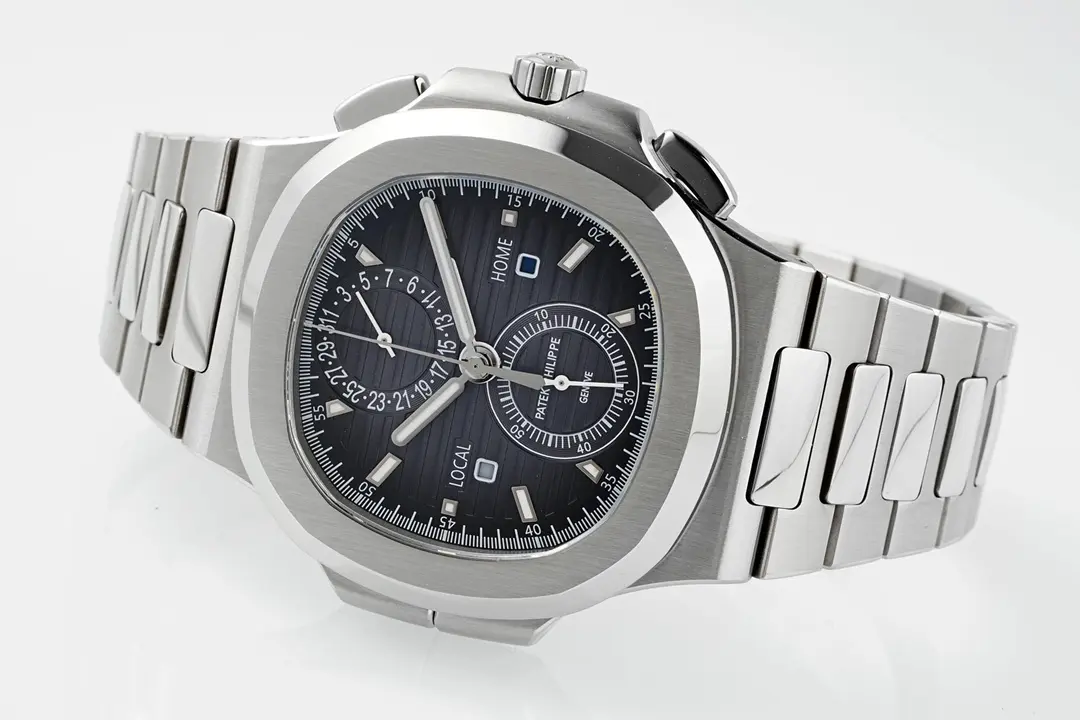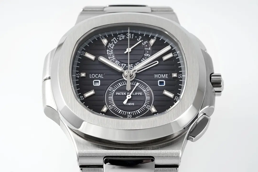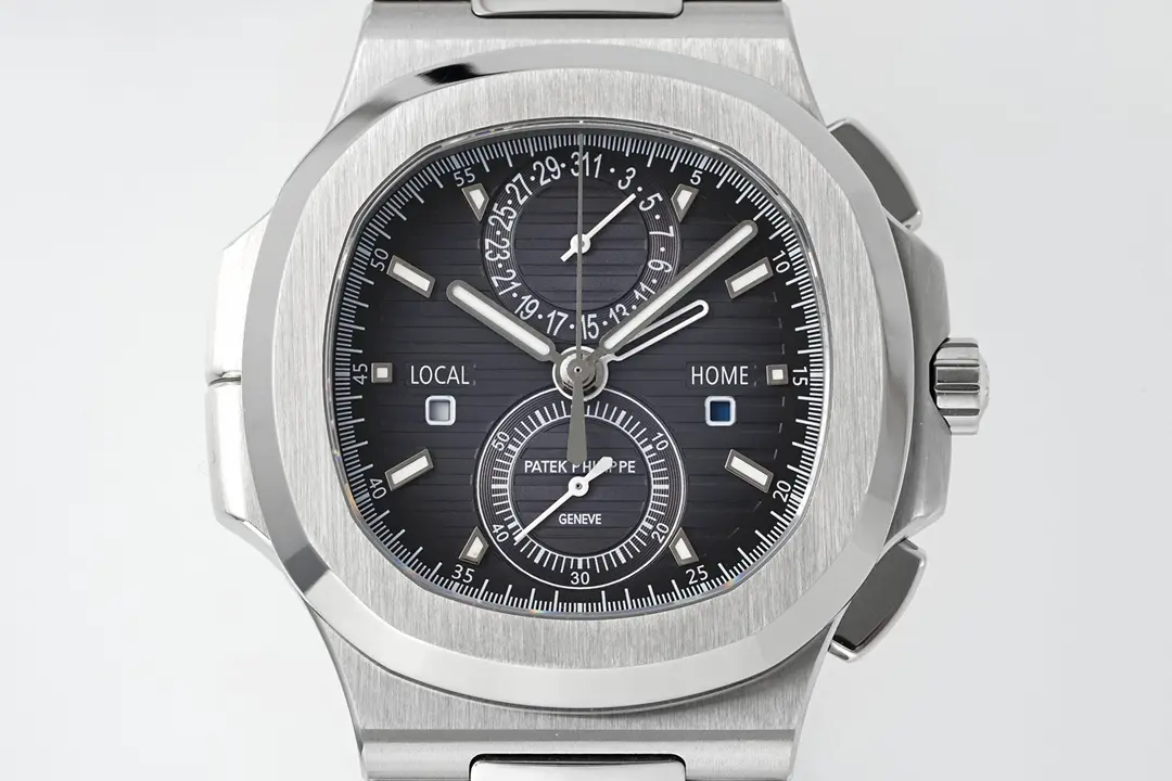 Patek Philippe Nautilus 5990/1A Dual Time Steel Black — Premium 1:1 super clone. Case: 904L stainless steel or 18k gold case. Crystal: Genuine sapphire crystal with AR coating. Movement: Clone Cal. 5711A (28,800 bph, date at 3 o’clock, small seconds). Price: $900. 12-month movement warranty. Free worldwide shipping on orders over $1,200.