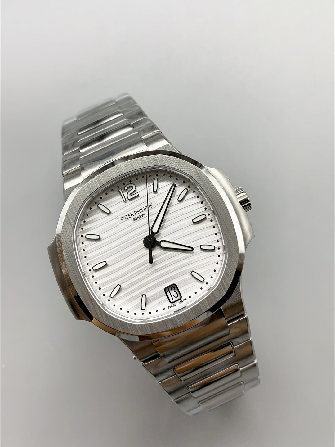 Patek Philippe Nautilus 5711/1A Silver — Premium 1:1 super clone. Case: 904L stainless steel or 18k gold case. Crystal: Genuine sapphire crystal with AR coating. Movement: Clone Cal. 5711A (28,800 bph, date at 3 o'clock, small seconds). Price: $800. 12-month movement warranty. Free worldwide shipping on orders over $1,200.