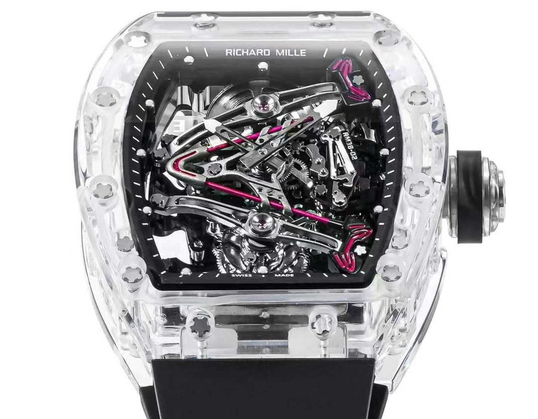 Crystal Hollow Richard Mille RM 38-02 Tourbillon Watch. The size of 41mm x 50mm, the transparent crystal case, can admire the complex movement inside 360 degrees. The hollow bridge on the dial has a pink “V” shape, which was inspired by Bubba Watson’s golf club head. This watch is equipped with a black rubber strap, sapphire glass and 50 meters of water resistance. This watch perfectly combines design and technology