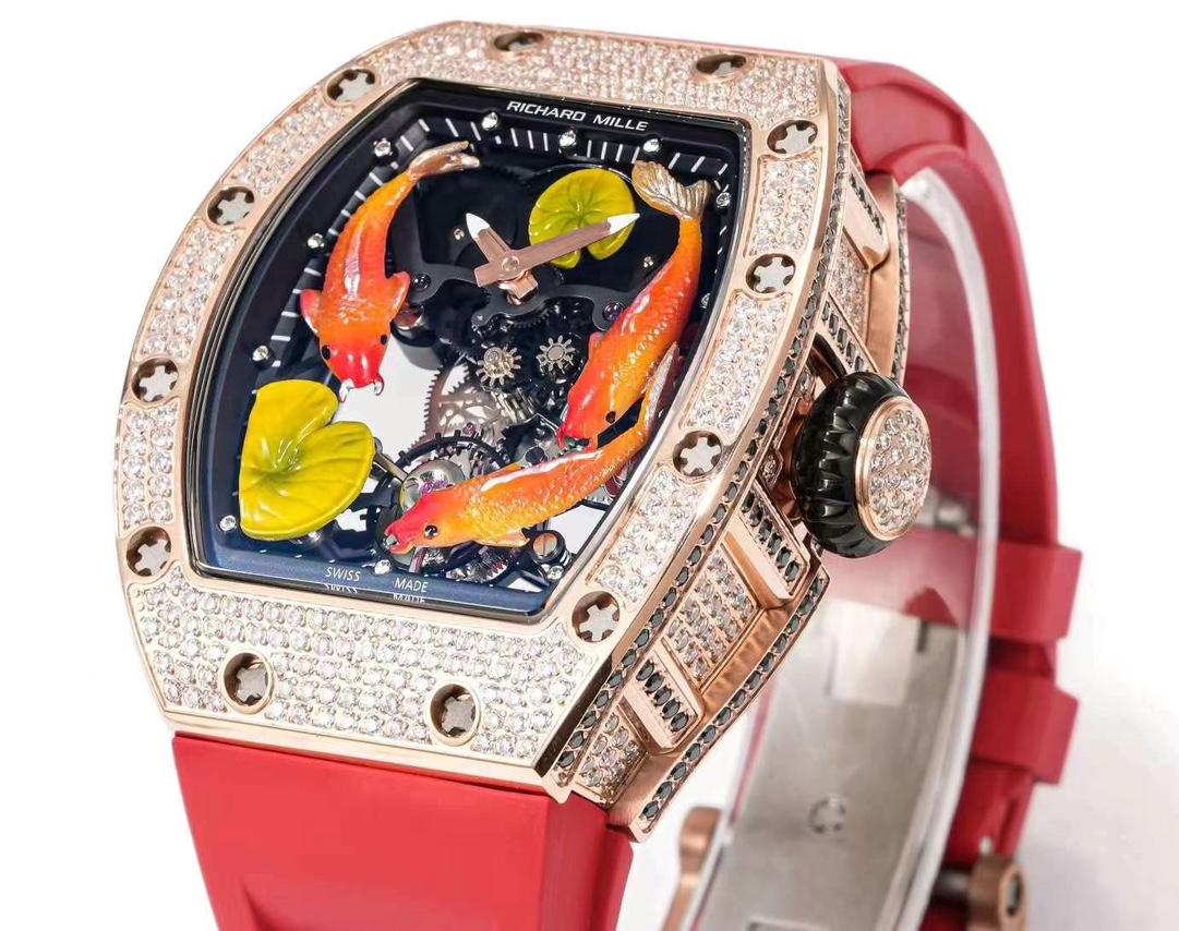The RICHARD MILLE RM S10 Koi Tourbillon Watch is a masterpiece in its own right that marries flawless workmanship with cultural richness. The watch boasts a breathtaking koi fish pattern, inspired by the mythical icon of good luck in Chinese legend. Three exquisitely realized koi cruise serenely on the face, over the serene waters of a mechanical sea. The rarity of the combination of the tourbillon and koi fish represents fortune and prosperity and thus an extremely sought-after watch among collectors of watches, particularly in China.