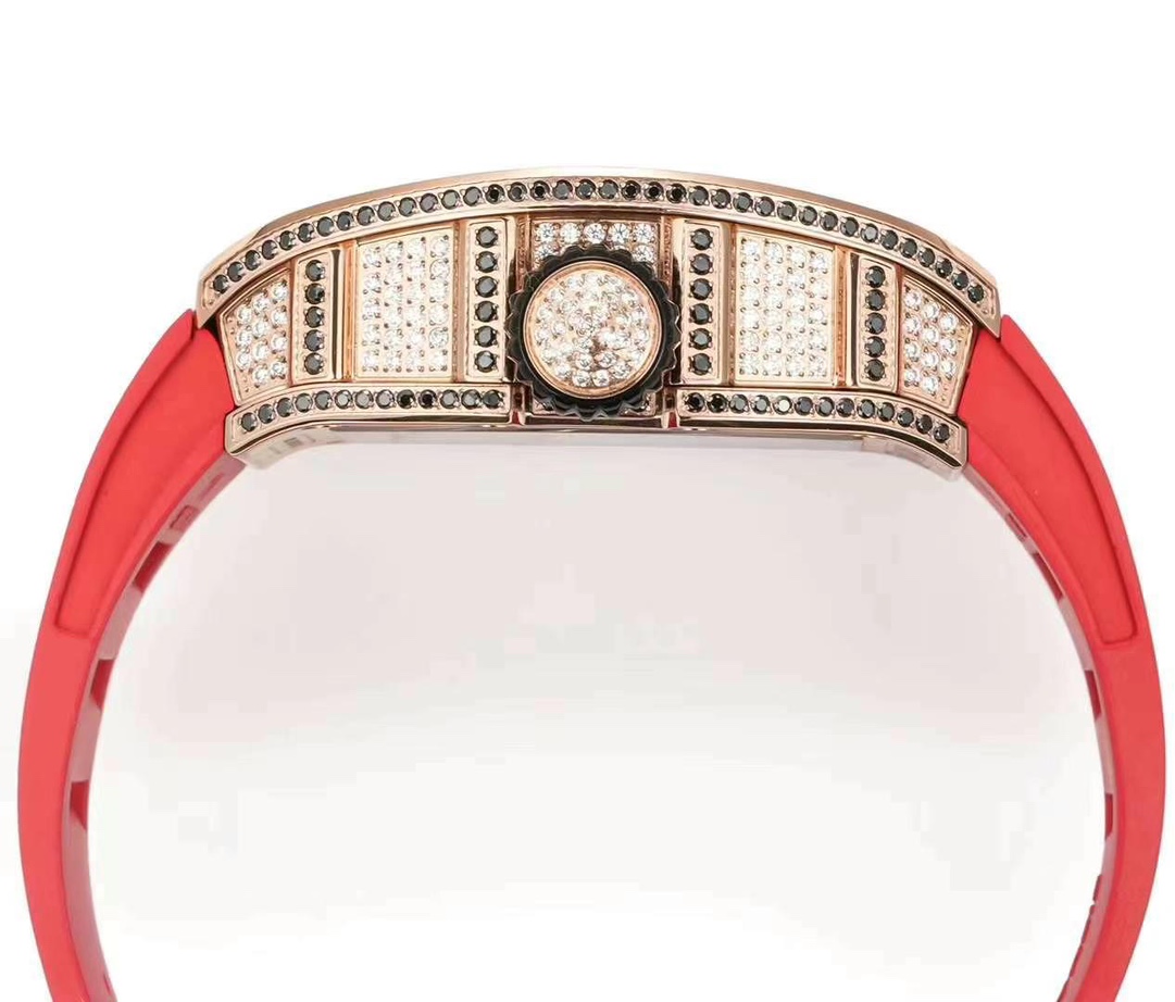 This RICHARD MILLE RM S10 watch is made in rose gold with diamond trim and has a bold red leather strap. The watch comes with an open case back skeletonized case to reveal the Swiss movement precision. At 50 meters water resistance, this sport watch mixes style and resilience.
