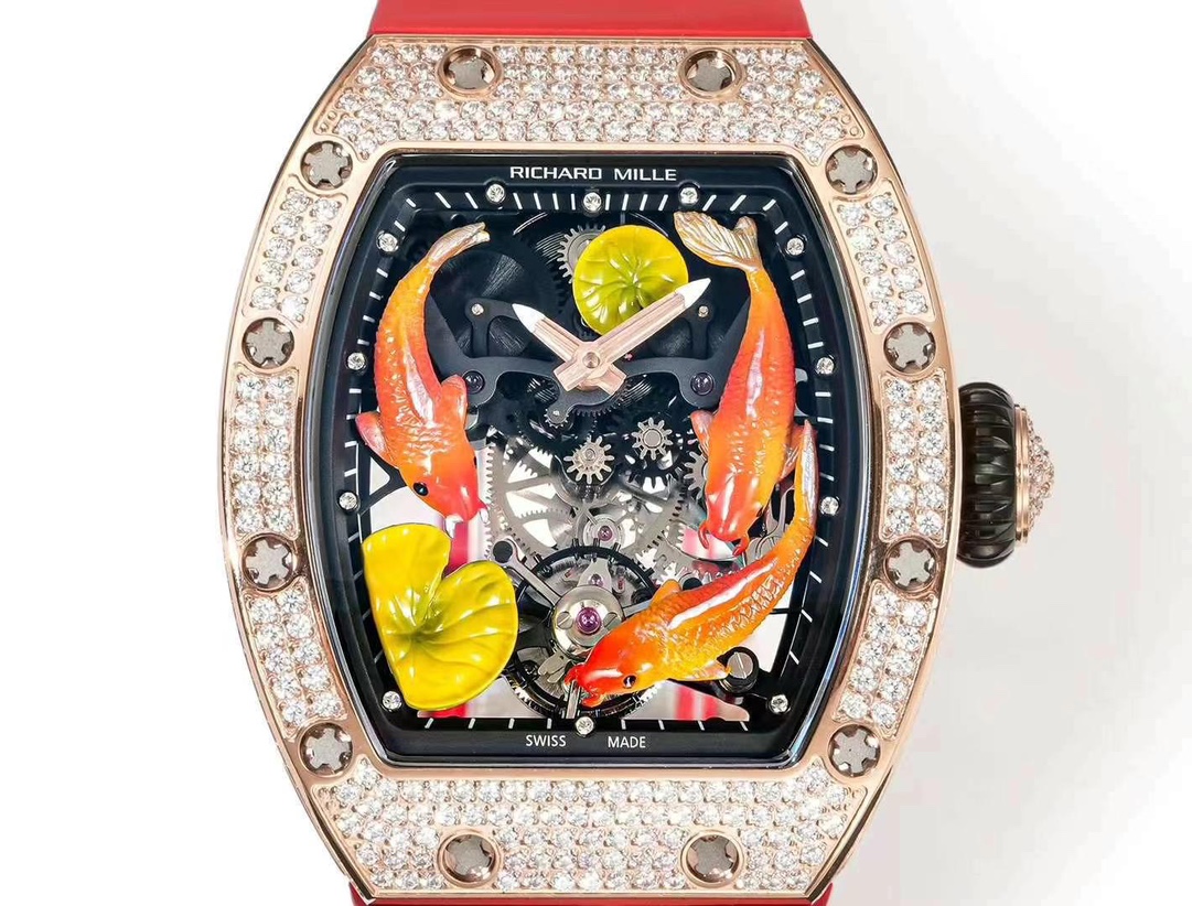 Replica Richard Mille RM S10 Koi Tourbillon Watch Rose Gold with Diamond – Red Leather Strap