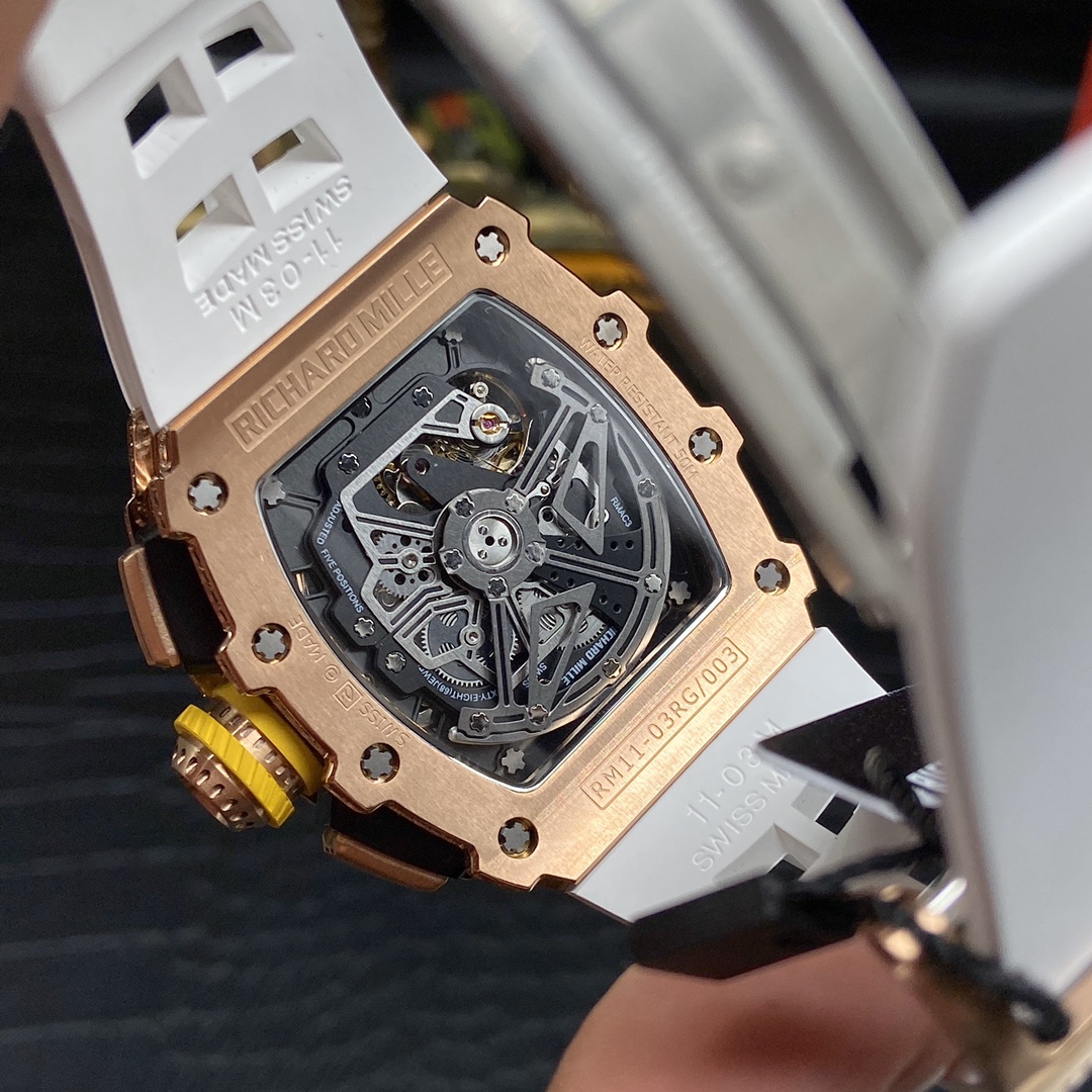 Finishing off the watch is a white rubber strap that reconciles luxury and comfort. The Richard Mille RM 11-03 replica is protected by strong sapphire crystal and features 30 meters of water resistance. A work of art in design, but also durable enough for daily confidence.