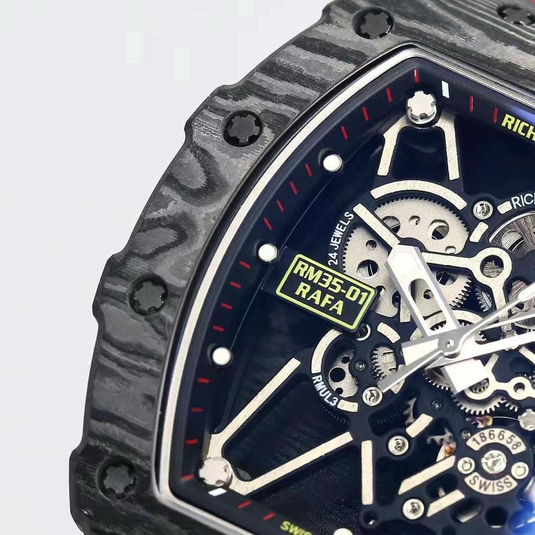 Meet the Richard Mille RM 35-01 replica with a 49.94mm x 44.5mm case made of ultra-light carbon, this thing feels like air on the wrist but looks like a million bucks.