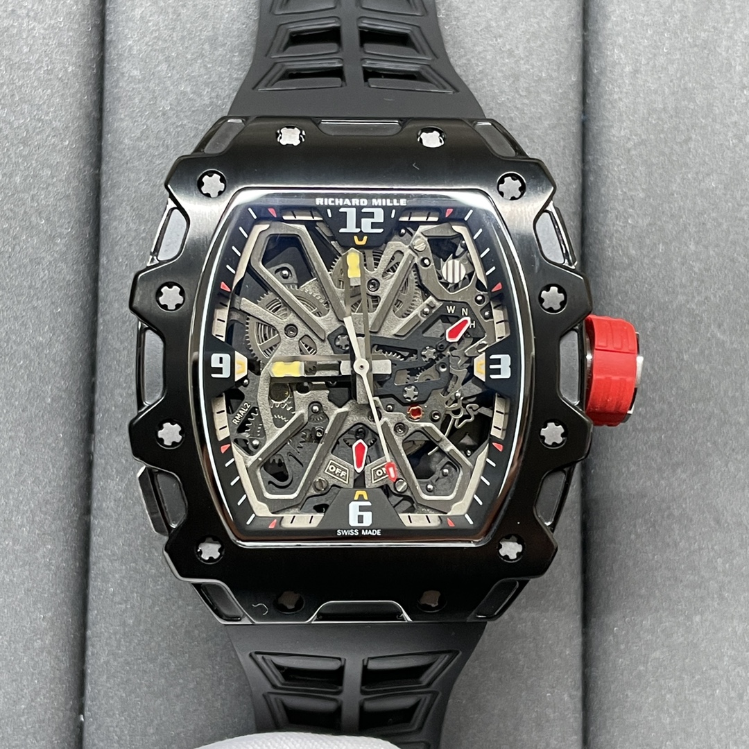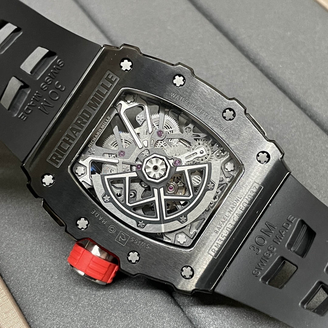 RM 35-03 replica with steel case, black rubber strap and skeleton dial inspired by the Rafael Nadal edition.