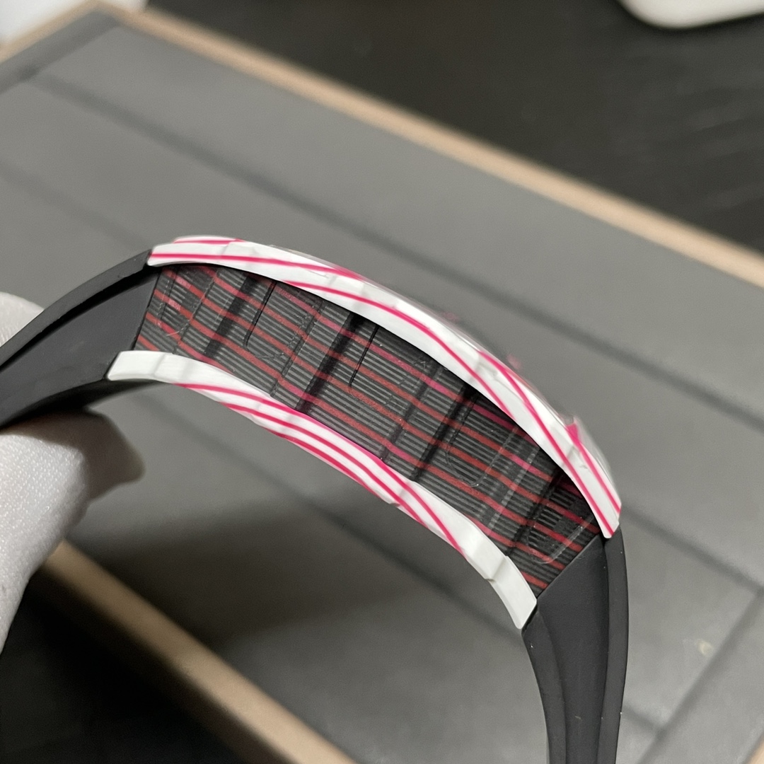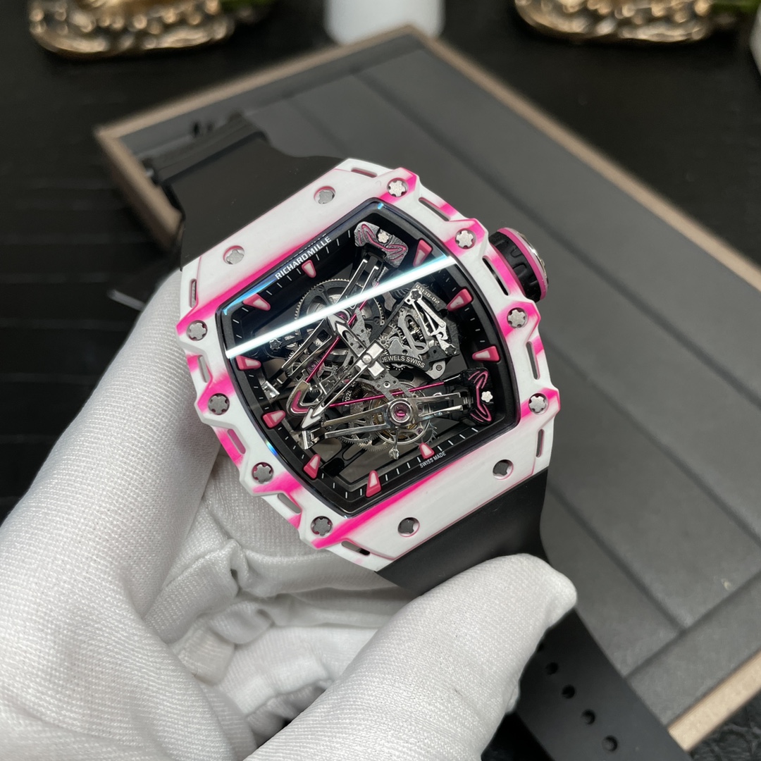 The RM 38-02 Bubba Watson replica brings one of the boldest Richard Mille color combinations into the lineup with a white and pink Quartz TPT case. Its skeletonized dial and manual tourbillon layout create the same aggressive, technical look that makes the original so collectible.