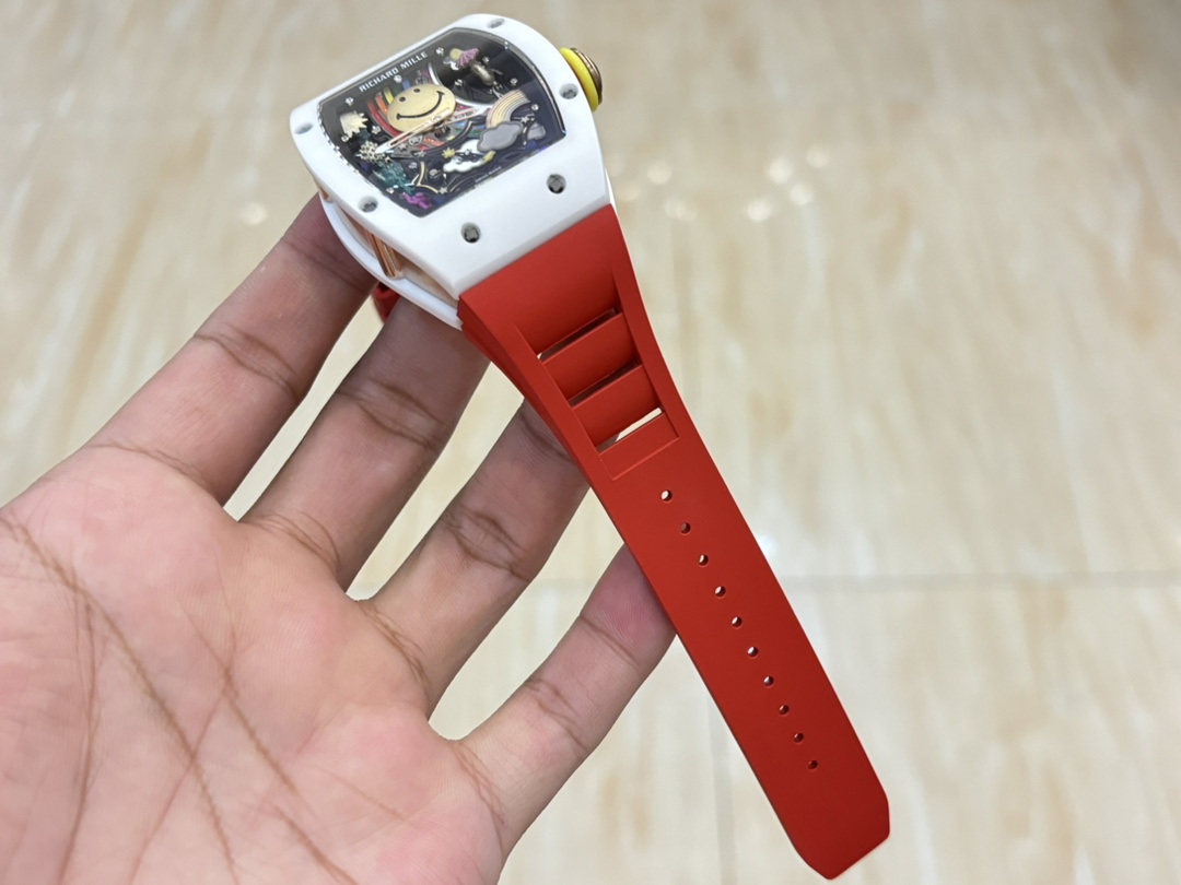 Richard Mille RM 88 Smiley Automatic Tourbillon Watch is a happy and creative watch that combines playful elements with the finest watchmaking technology. The smiley face at the top of the dial, made of micro-sandblasted and painted gold, emphasizes the watch. The colorful flower, sun, pineapple, cactus, flamingo, and rainbow motifs surrounding the smiley create the illusion of happiness and playfulness.