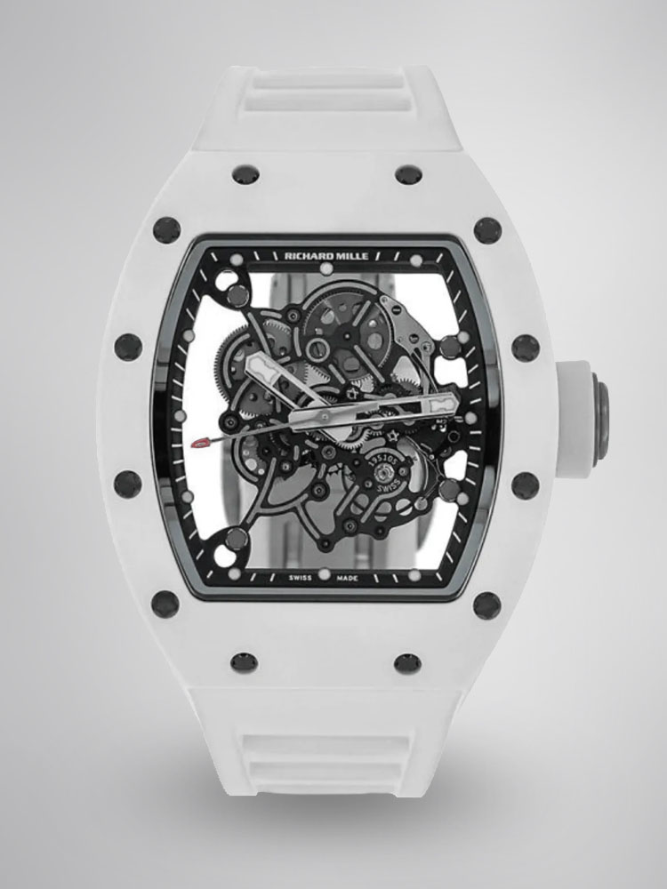 The Richard Mille RM055 BBR White Ceramic Skeleton watch is a luxury sports watch of exceptional design, this one watch has performance and style for everyone. Crafted with a Swiss movement and housed in a durable white ceramic case, it features a unique tonneau-shaped dial and a hollow skeletonized base to showcase the intricate movement inside. The white rubber strap is comfortable to wear, perfect for both casual and formal occasions. Water-resistant to 50 meters, this watch is not only for display, but also for practical functions. This AAA Super Clone watch is a true Swiss replica and a perfect addition to any collection.