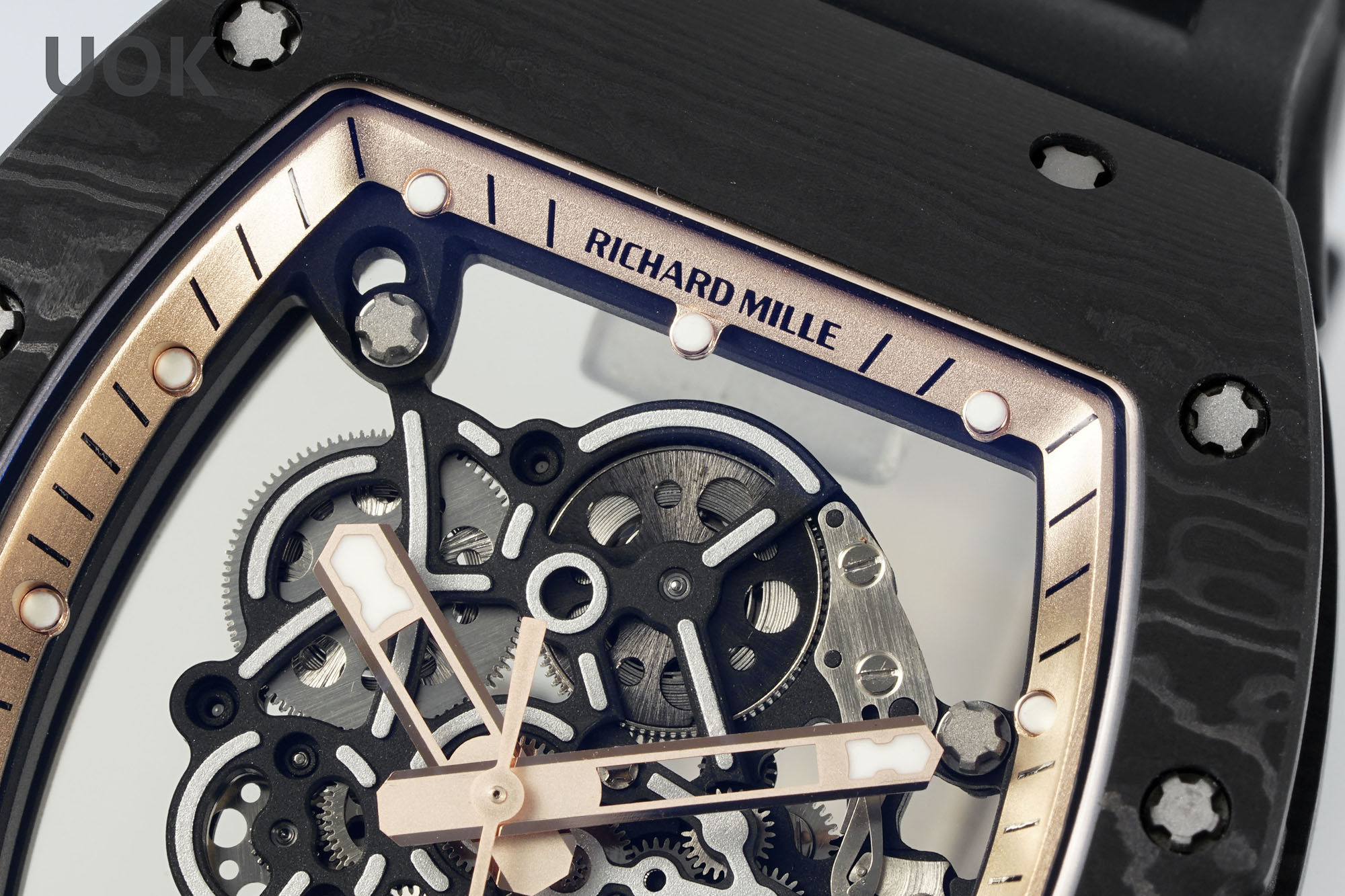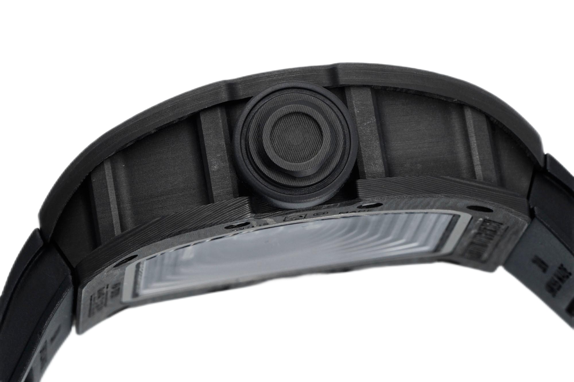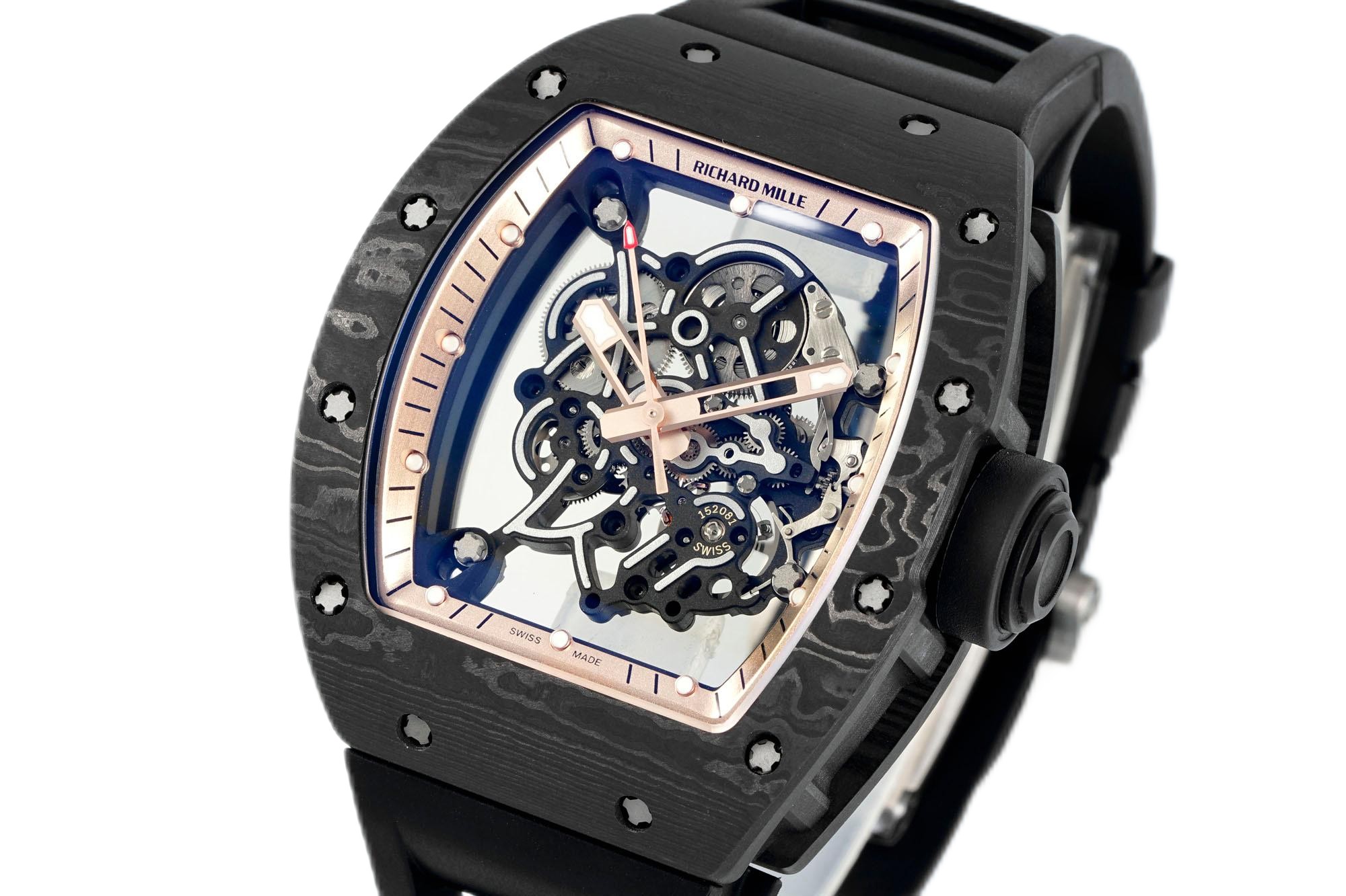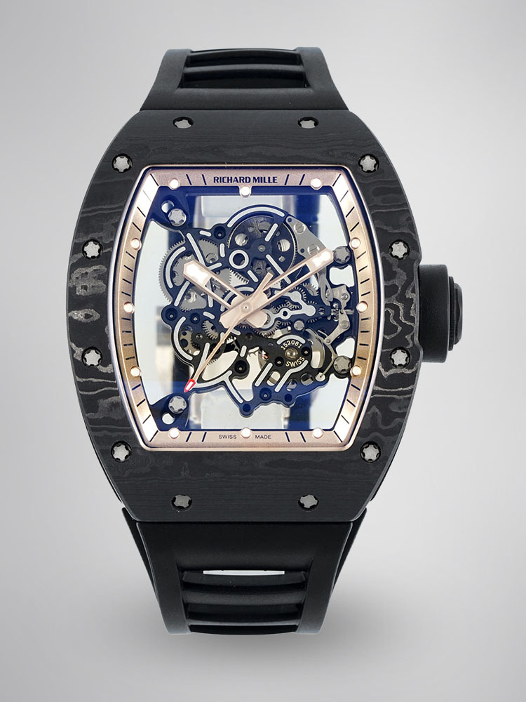 Experience luxury and innovation with the Richard Mille RM055 Skeleton Watch. Made with precision, this timepiece incorporates a durable carbon fiber dial and light titanium case for strength and comfort. Weighing only 74.3g, it has no equal in lightness and is perfectly suitable for daily wear and adventure. It has a transparent skeleton design showing the delicate Swiss movement in the most unique way. Its strap, sleek and black, is made from rubber to ensure your comfort while keeping a firm hold. Equipped with a scratch-resistant sapphire crystal and 50 meters of water resistance, the watch definitely exudes style with its performance. Step up your watch collection with this premium replica.