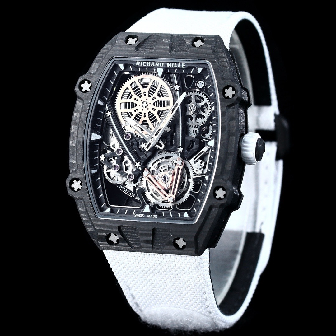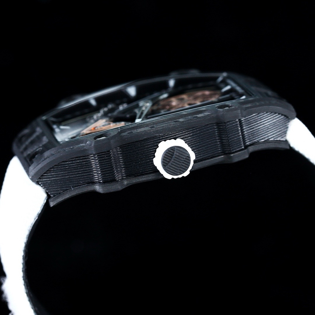 The RM 27-05 Flying Tourbillon Rafael Nadal replica watch exemplifies the pinnacle of mechanical design and performance. With its 37.25 x 47.25 x 9mm dimensions, this Super Clone timepiece combines precision with a distinctive aesthetic. The openwork dial reveals the intricacies of the V-shaped bridge and the tourbillon bridge, creating a stunning visual contrast. The manually-wound movement is beautifully showcased with the visible winding mechanism, adding a dynamic touch to the piece.