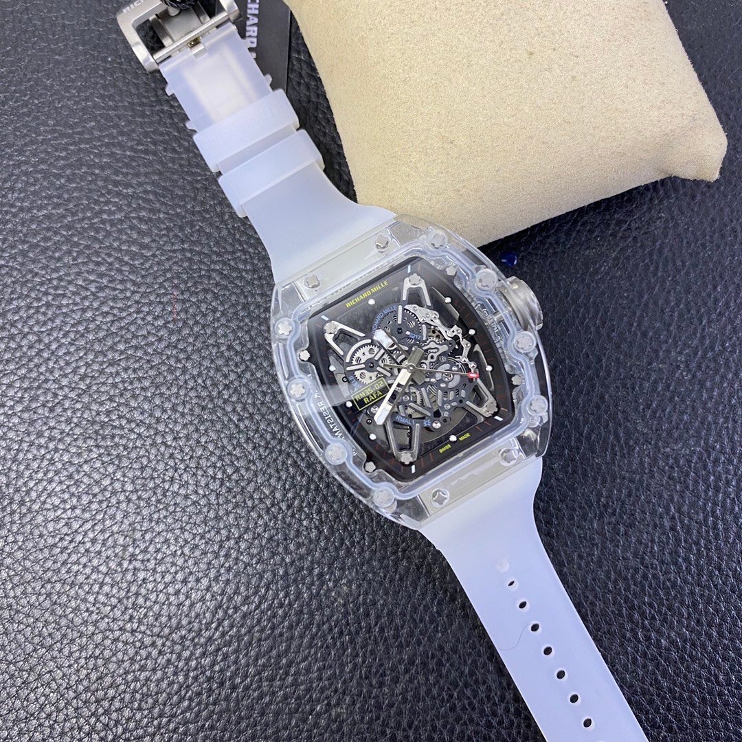 RM035-02 Transparent Shell Edition — Premium 1:1 super clone. Case: Titanium / carbon composite tonneau case. Crystal: Genuine sapphire crystal front and back. Movement: Clone RM caliber (skeletonized automatic). Price: $2,450. 12-month movement warranty. Free worldwide shipping on orders over $1,200.