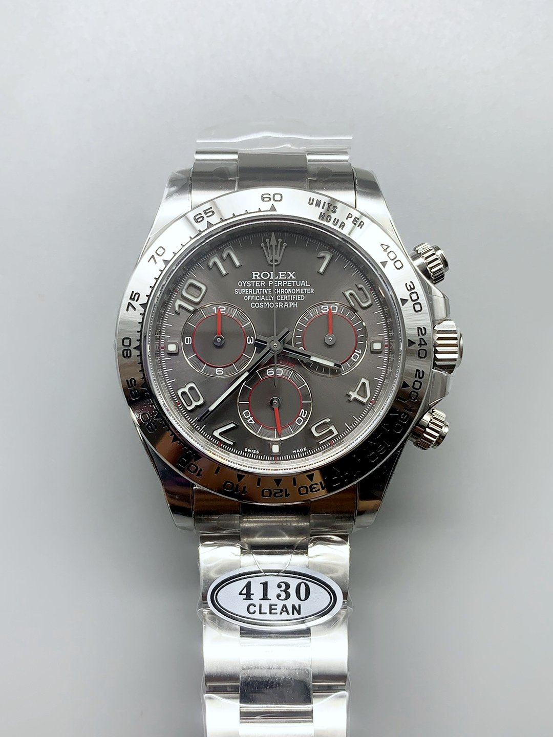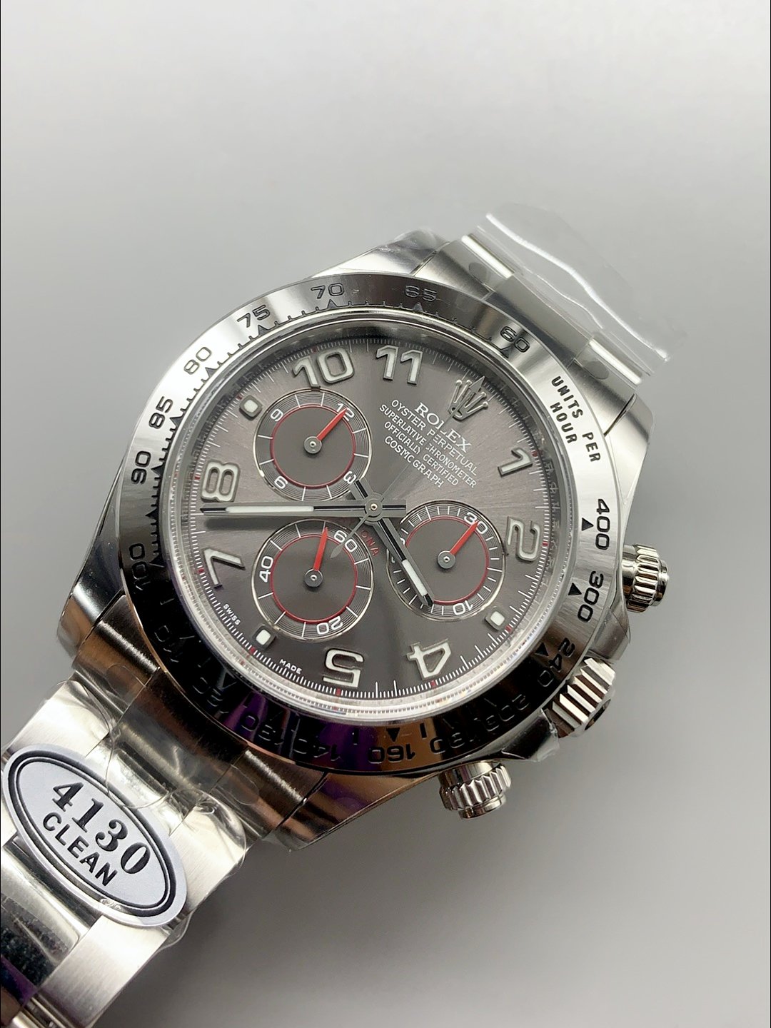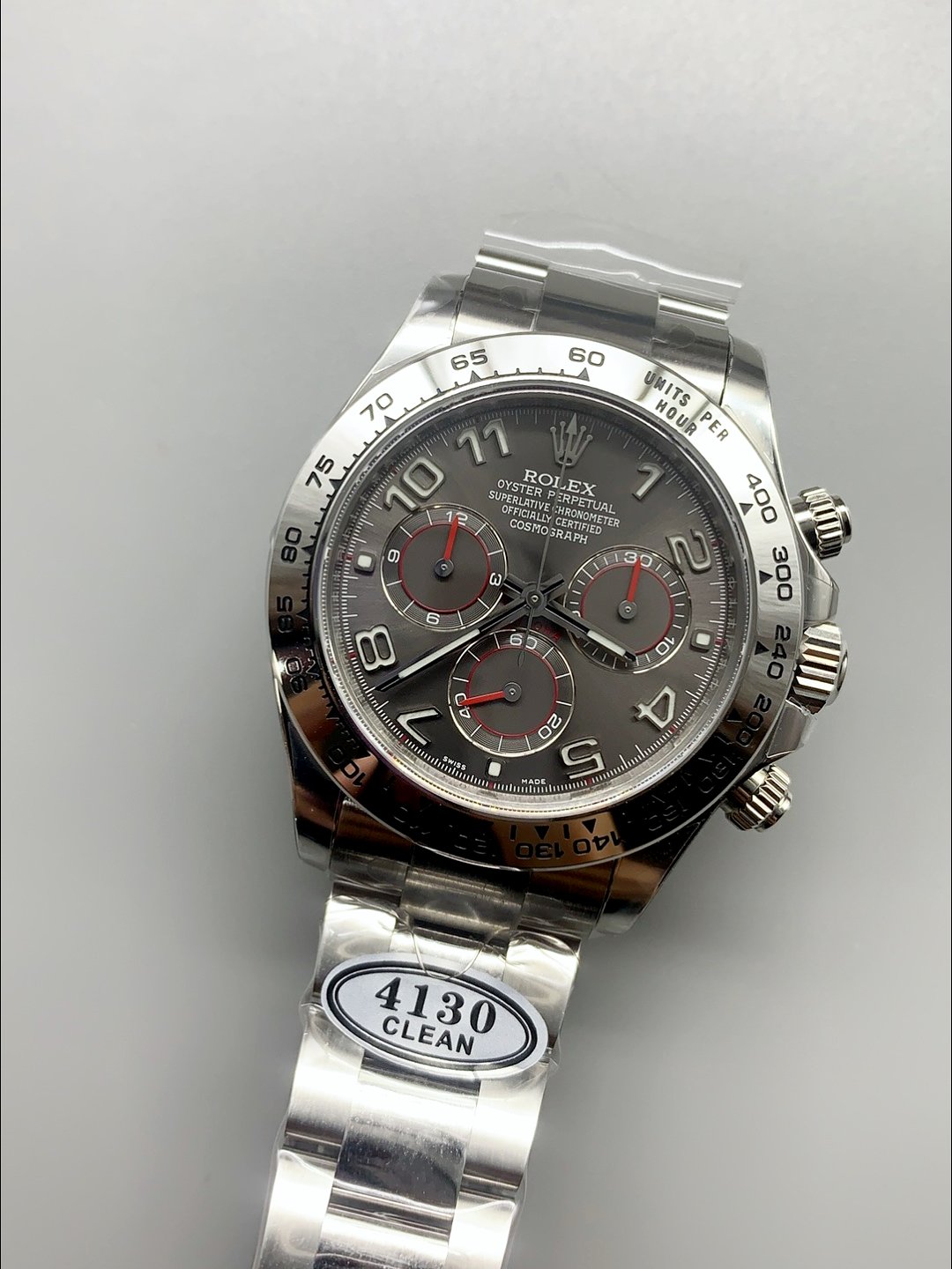 Rolex Cosmograph Daytona M116519 Original Cal.4130 Movement – Grey Dial( ) — Premium 1:1 super clone. Case: 904L stainless steel case and bracelet. Crystal: Genuine sapphire crystal with AR coating. Movement: Clone Cal. 3235 (28,800 bph, 70hr power reserve, date). Price: $1,650. 12-month movement warranty. Free worldwide shipping on orders over $1,200.