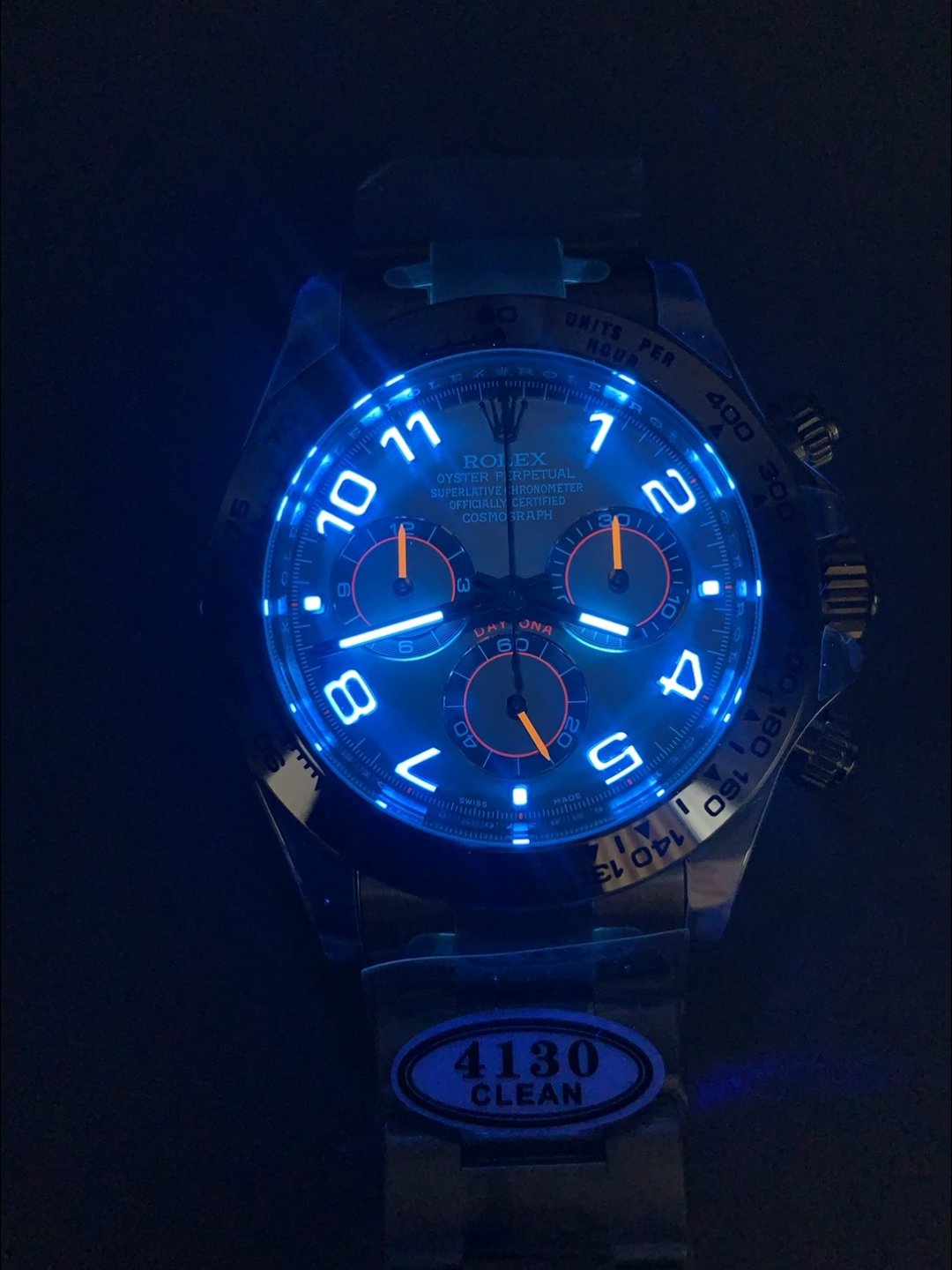 Rolex Daytona Custom Carbon Fiber Night Glow Case Watch – Black with Rainbow Bezel, Beige Strap — Premium 1:1 super clone. Case: 904L stainless steel case and bracelet. Crystal: Genuine sapphire crystal with AR coating. Movement: Clone Cal. 4130 (column-wheel flyback chronograph). Price: $859. 12-month movement warranty. Free worldwide shipping on orders over $1,200.