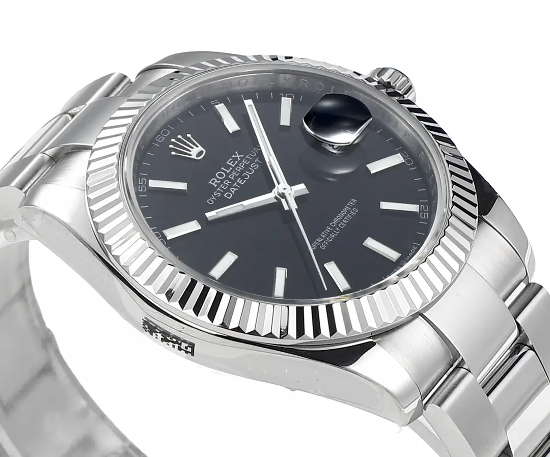 Rolex Datejust 42mm has a black dial with stainless steel construction. It features a black dial and a stainless steel construction, offering a premium look similar to a.