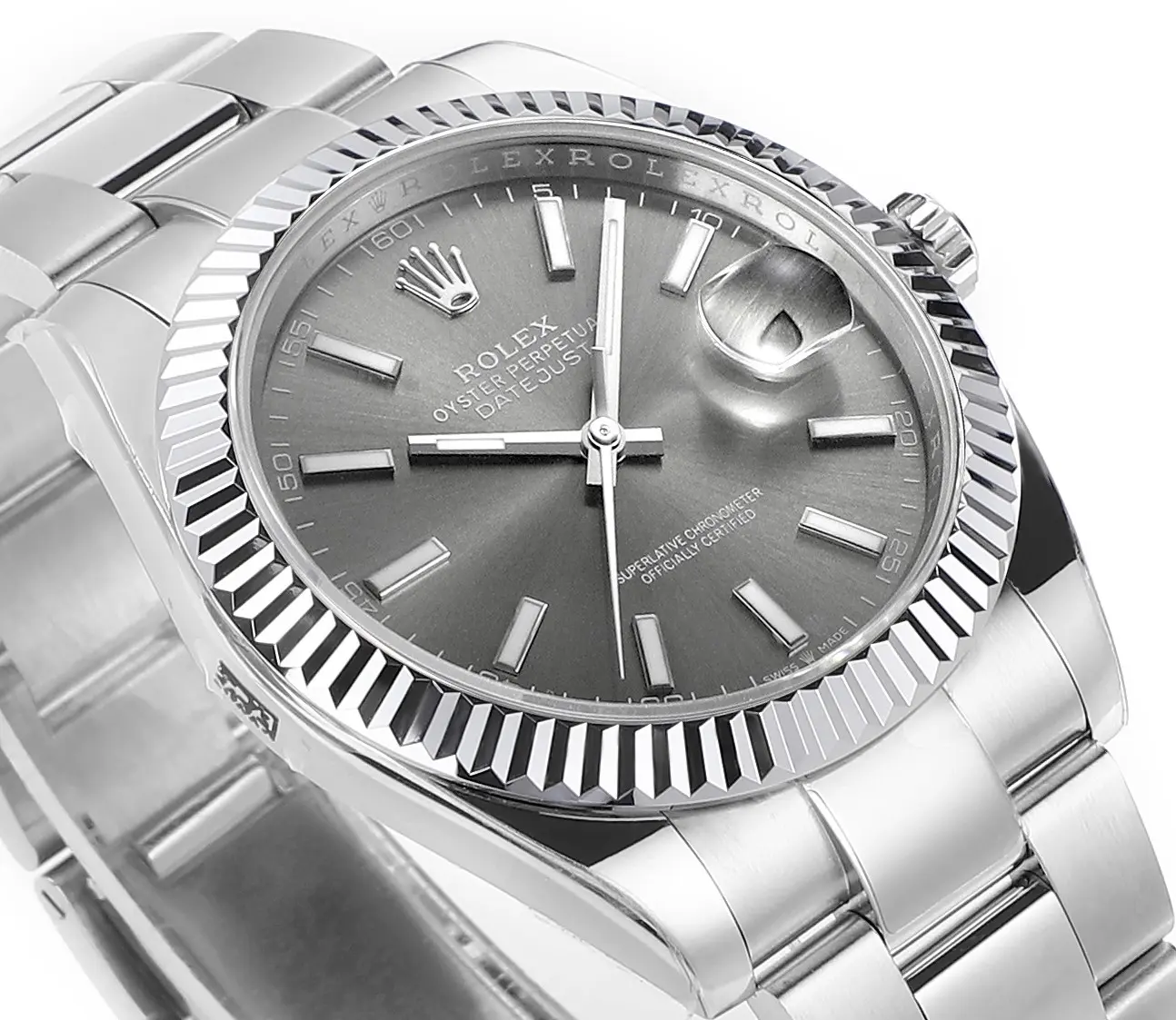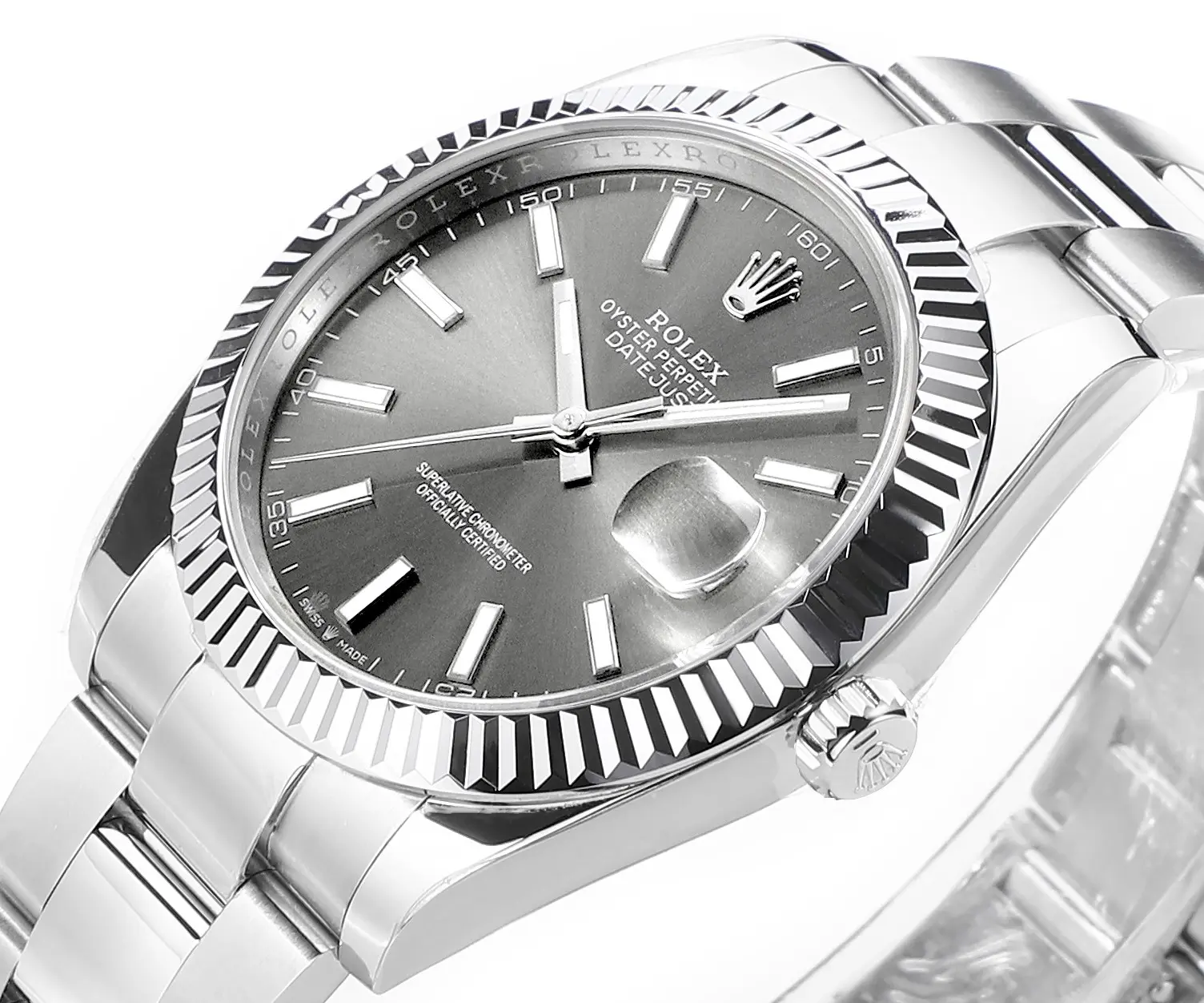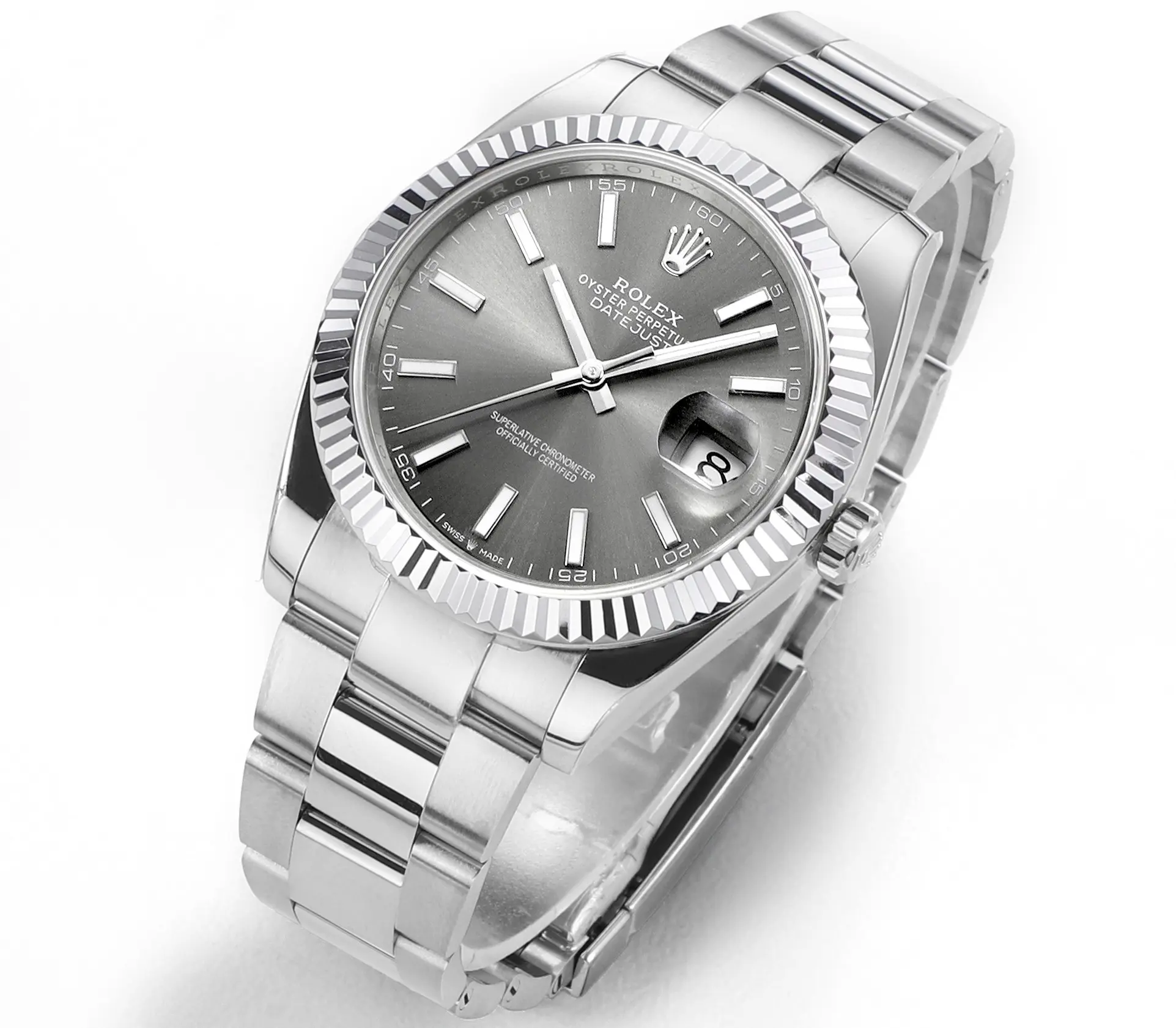 Rolex Datejust 41mm Watch – Silver Fluted Bezel, Grey Dial, Stainless Steel Bracelet Rolex