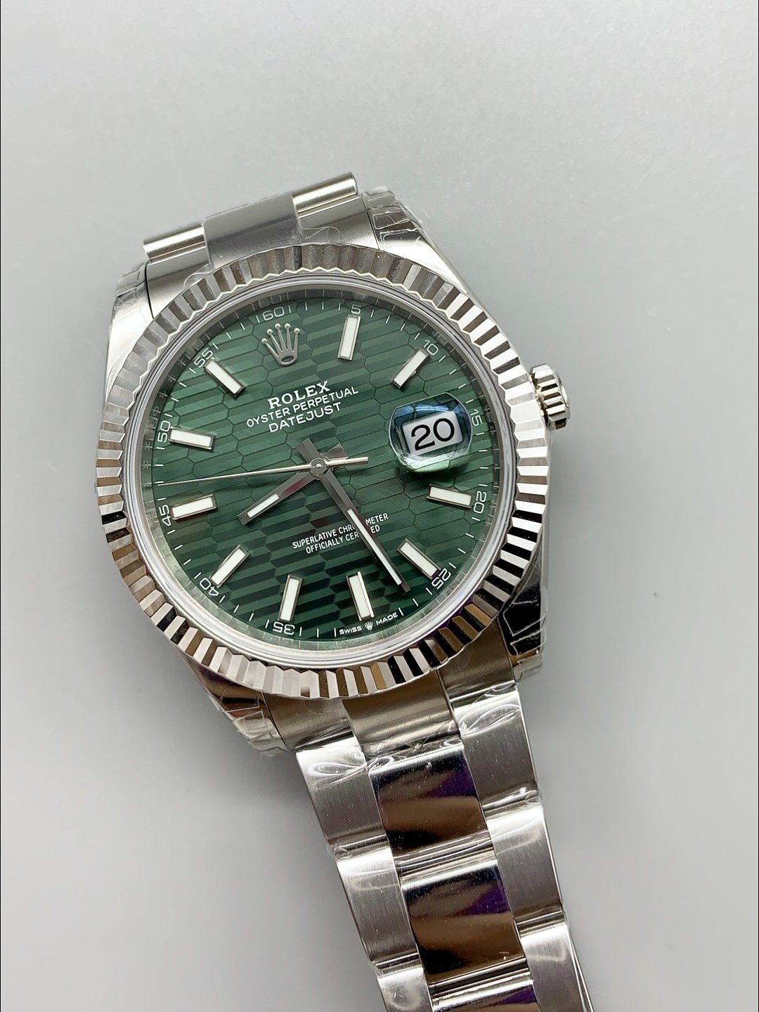 Rolex Datejust Cal.3235 Movement 904L Steel 41MM – Green Fluted Motif Dial () — Premium 1:1 super clone. Case: 904L stainless steel case and bracelet. Crystal: Genuine sapphire crystal with AR coating. Movement: Clone Cal. 3235 (28,800 bph, 70hr power reserve, date). Price: $1,650. 12-month movement warranty. Free worldwide shipping on orders over $1,200.