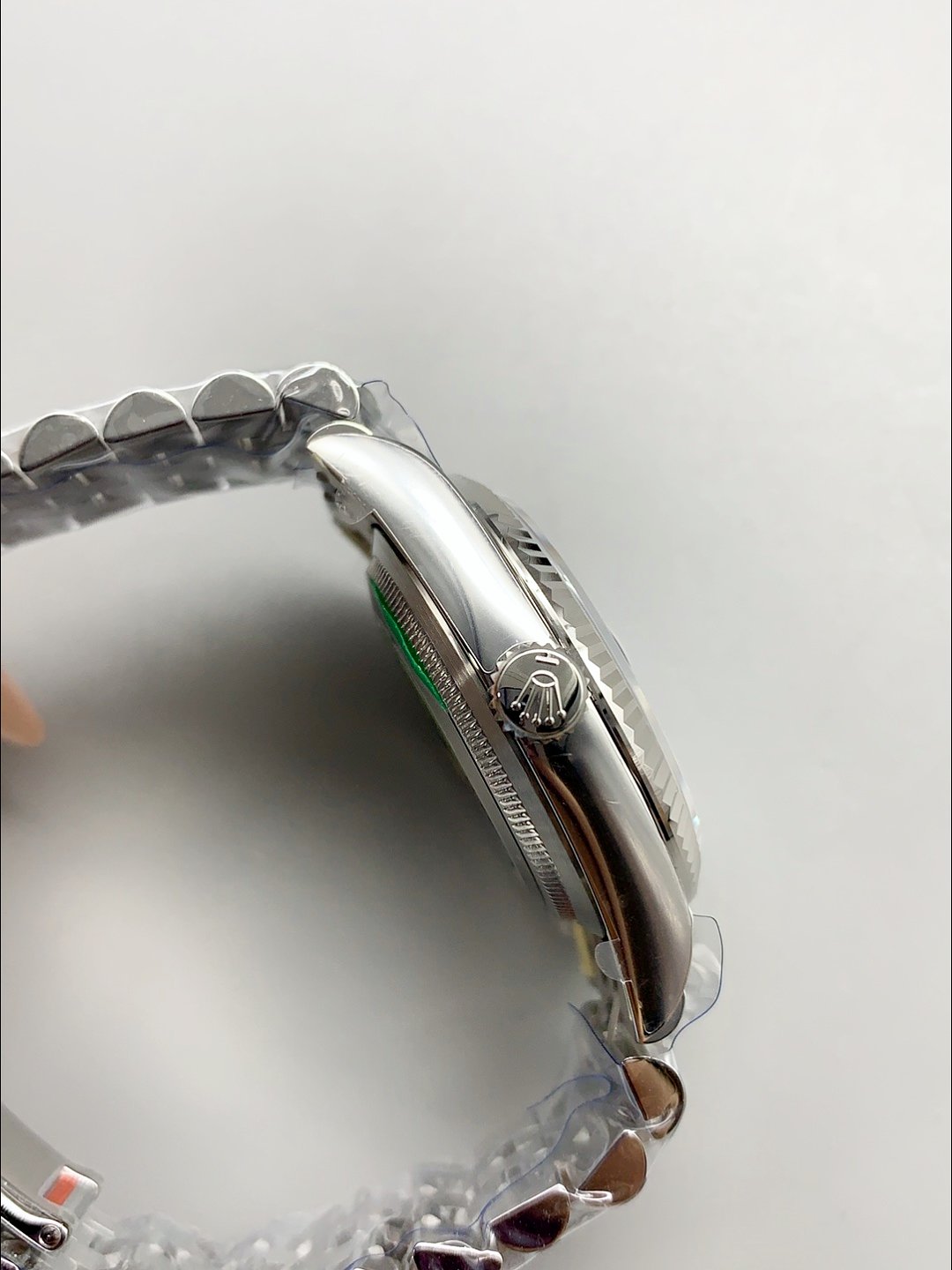 Rolex Datejust 41 Custom Malachite Dial Green Watch — Premium 1:1 super clone. Case: 904L stainless steel case and bracelet. Crystal: Genuine sapphire crystal with AR coating. Movement: Clone Cal. 3235 (28,800 bph, 70hr power reserve). Price: $859. 12-month movement warranty. Free worldwide shipping on orders over $1,200.