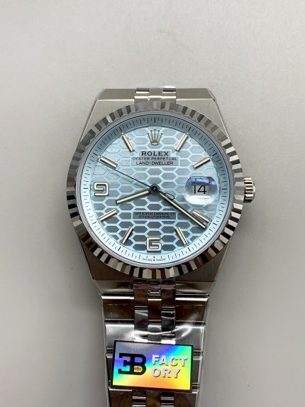 Rolex Land-Dweller 127336 Ice Blue Honeycomb 40MM (1;1 ) — Premium 1:1 super clone. Case: 904L stainless steel case and bracelet. Crystal: Genuine sapphire crystal with AR coating. Movement: Clone Cal. 3235 (28,800 bph, 70hr power reserve, date). Price: $1,650. 12-month movement warranty. Free worldwide shipping on orders over $1,200.
