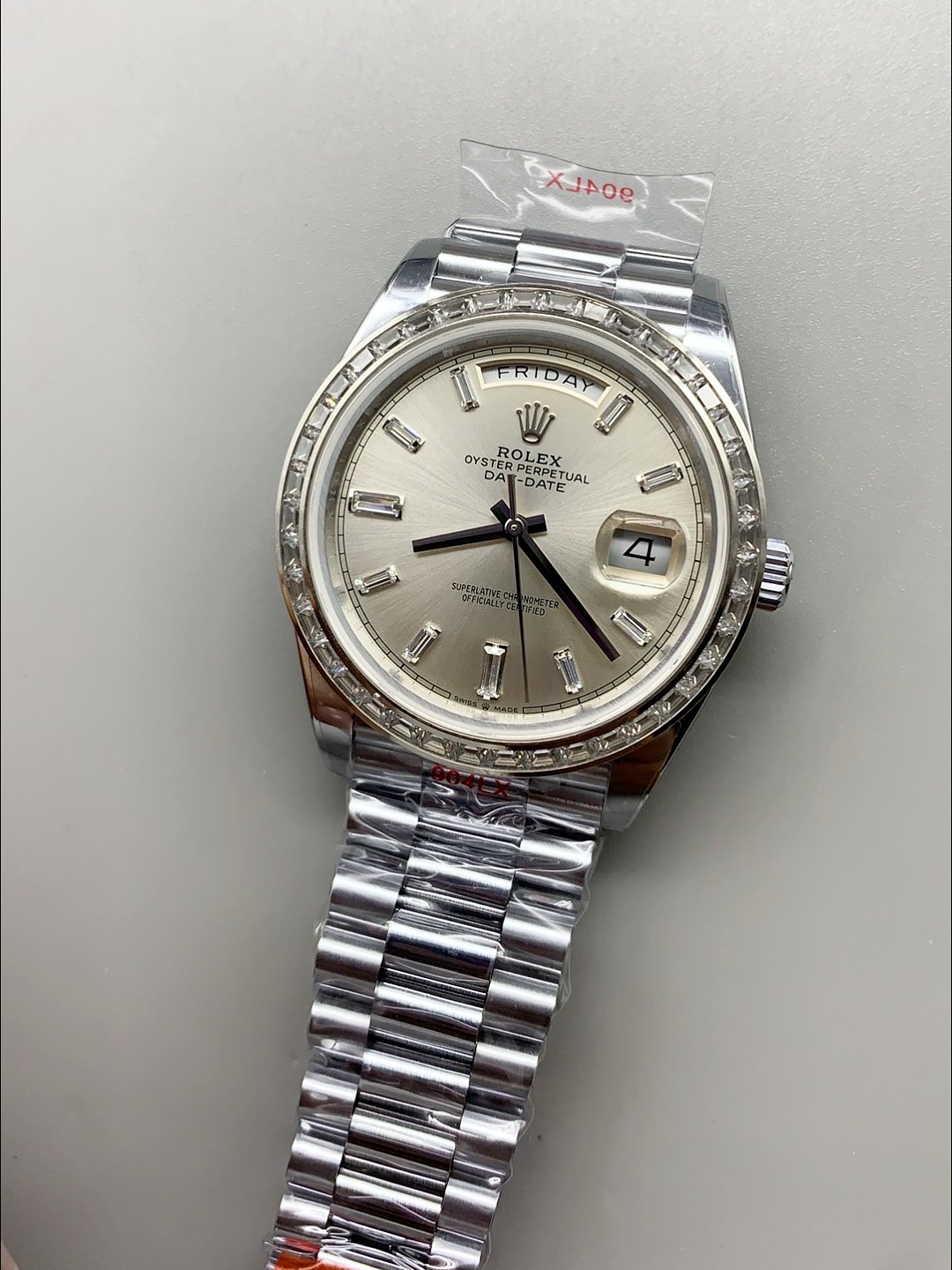 Rolex Day Date Presidential 904L Steel 40MM – Grey Dial () — Premium 1:1 super clone. Case: 904L stainless steel case and bracelet. Crystal: Genuine sapphire crystal with AR coating. Movement: Clone Cal. 3235 (28,800 bph, 70hr power reserve, date). Price: $1,650. 12-month movement warranty. Free worldwide shipping on orders over $1,200.
