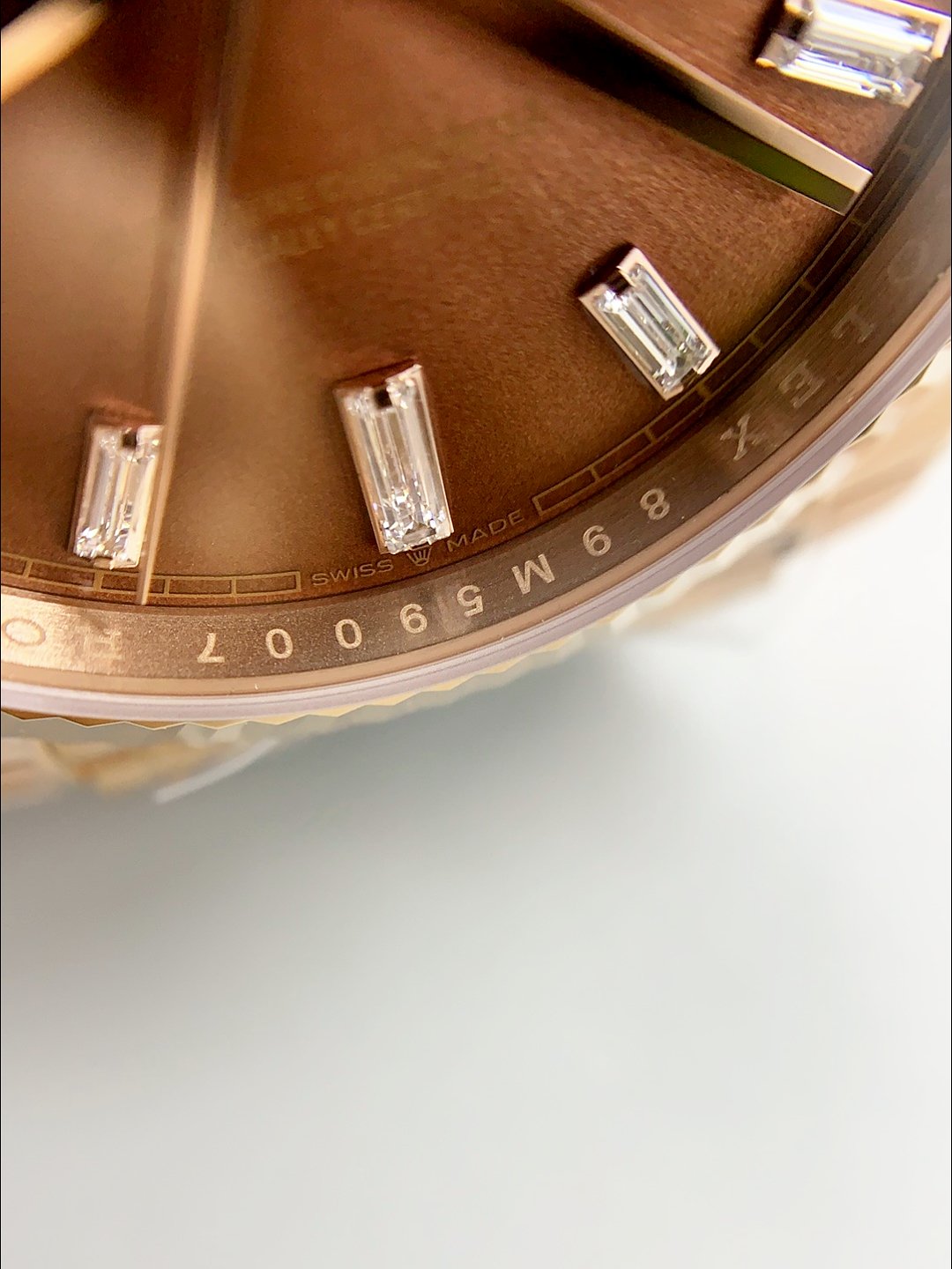 Rolex Day-Date 40 Rose Gold Chocolate Baguette Diamond Dial 228235(1;1 ) — Premium 1:1 super clone. Case: 904L stainless steel case and bracelet. Crystal: Genuine sapphire crystal with AR coating. Movement: Clone Cal. 3235 (28,800 bph, 70hr power reserve, date). Price: $1,650. 12-month movement warranty. Free worldwide shipping on orders over $1,200.