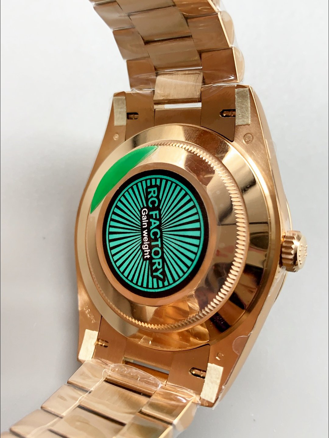 Rolex Day-Date 40mm With Green Dial And Rose Gold bracelet.(1;1Super Clone) — Premium 1:1 super clone. Case: 904L stainless steel case and bracelet. Crystal: Genuine sapphire crystal with AR coating. Movement: Clone Cal. 3235 (28,800 bph, 70hr power reserve, date). Price: $1,650. 12-month movement warranty. Free worldwide shipping on orders over $1,200.