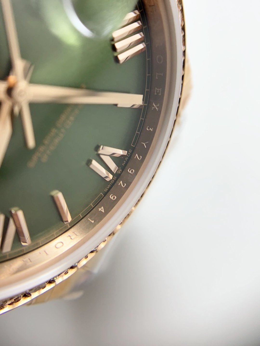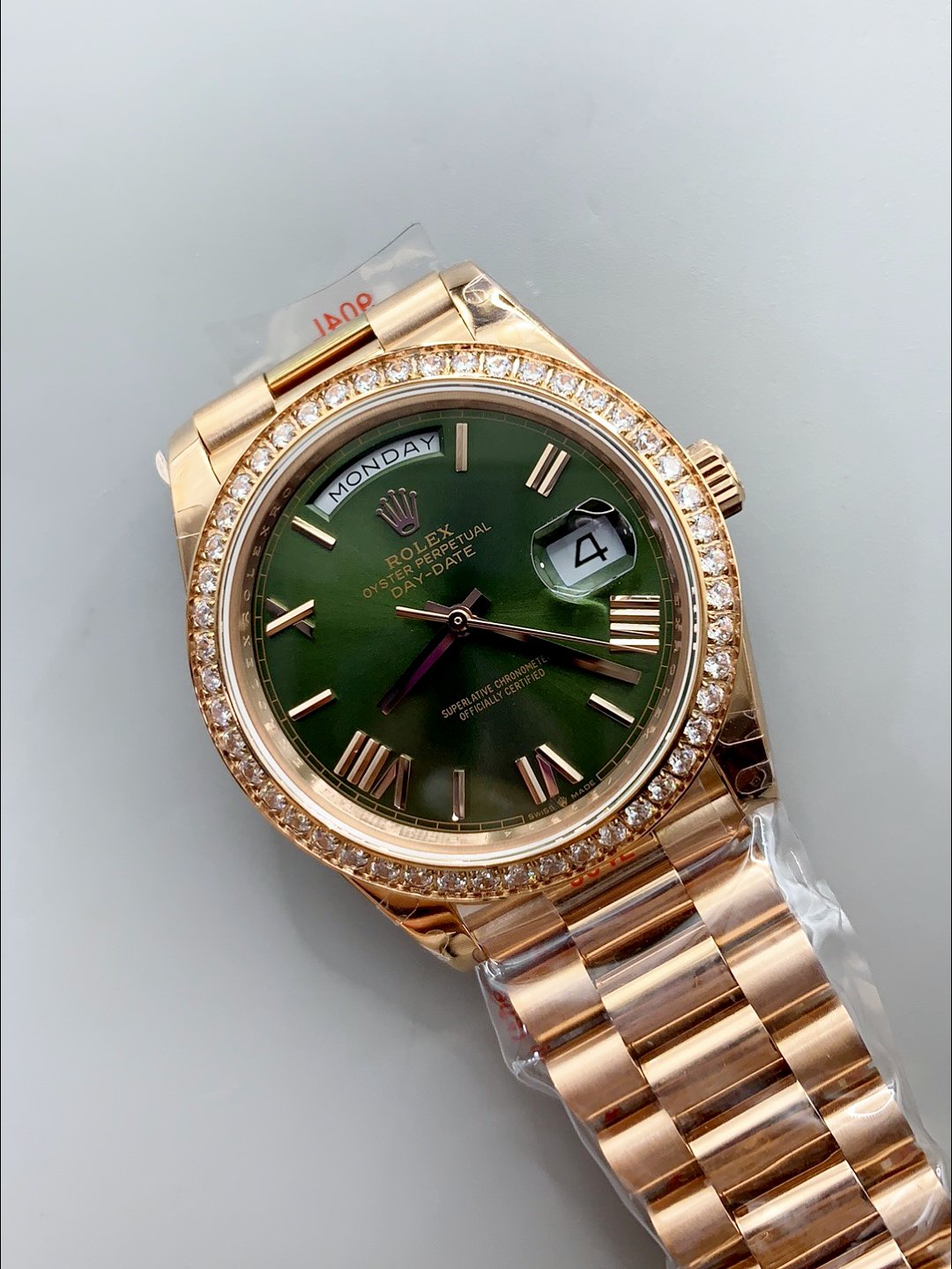 Rolex Day Date Presidential 18K Rose Gold Watch 40MM – Olive Green Dial() — Premium 1:1 super clone. Case: 904L stainless steel case and bracelet. Crystal: Genuine sapphire crystal with AR coating. Movement: Clone Cal. 3235 (28,800 bph, 70hr power reserve, date). Price: $1,650. 12-month movement warranty. Free worldwide shipping on orders over $1,200.