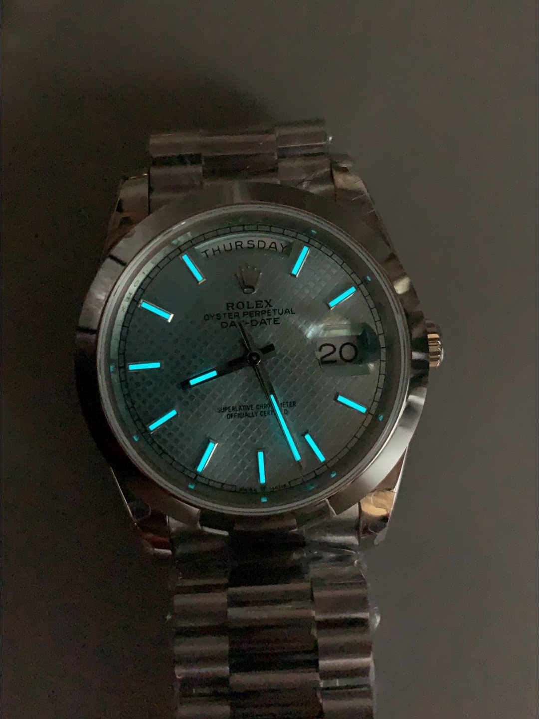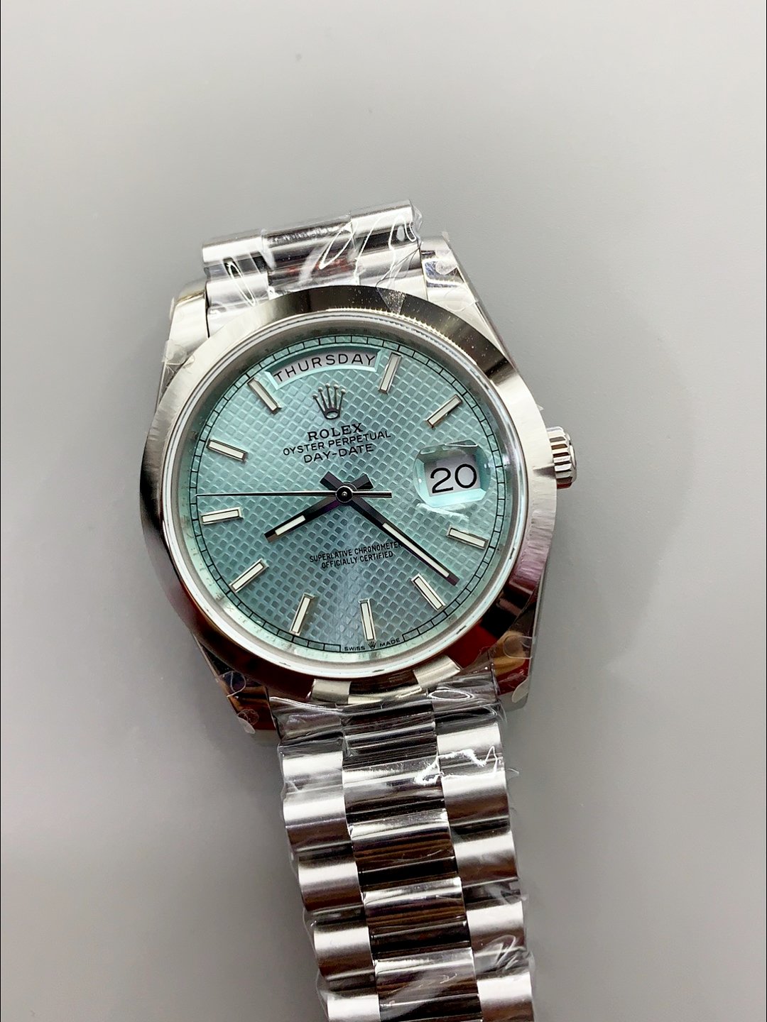 Rolex Day Date Presidential M228206-0004 904L Steel 40MM – Light Blue Dial () — Premium 1:1 super clone. Case: 904L stainless steel case and bracelet. Crystal: Genuine sapphire crystal with AR coating. Movement: Clone Cal. 3235 (28,800 bph, 70hr power reserve, date). Price: $1,650. 12-month movement warranty. Free worldwide shipping on orders over $1,200.