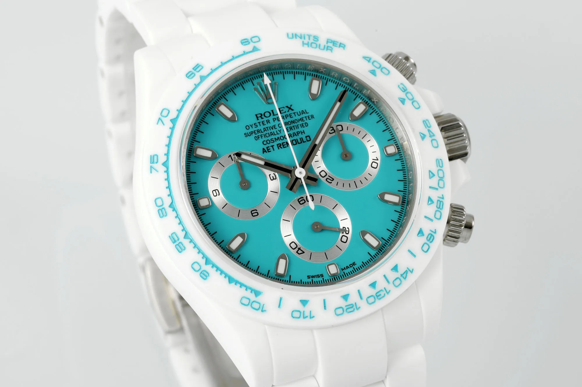 This AET x N6 Factory Daytona Ceramic Watch is the best value on the market. It features a stunning turquoise dial and a white band, and it’s designed with racing-style elegance for unmatched performance.